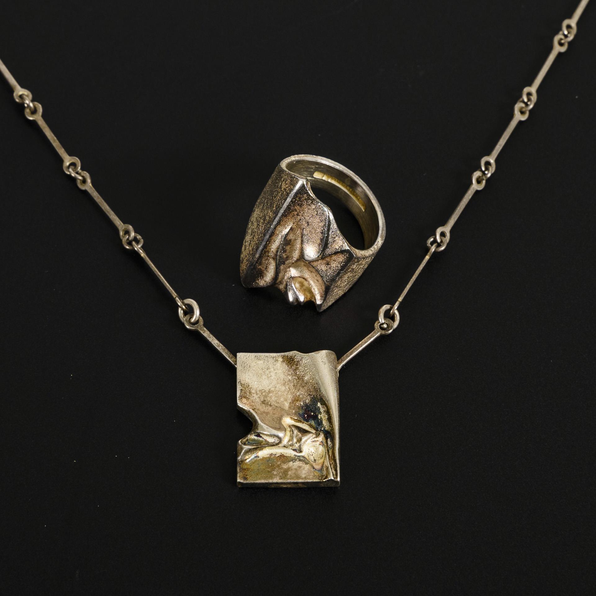 Silber 925 gestempelt. Punze: LAPPONIA, Jahrescode Kette G8, gefertigt 1984. Design: Björn Weckström Ringpunze undeutlich. Kette L 36 cm. Ringgröße 55. 22,6 g.