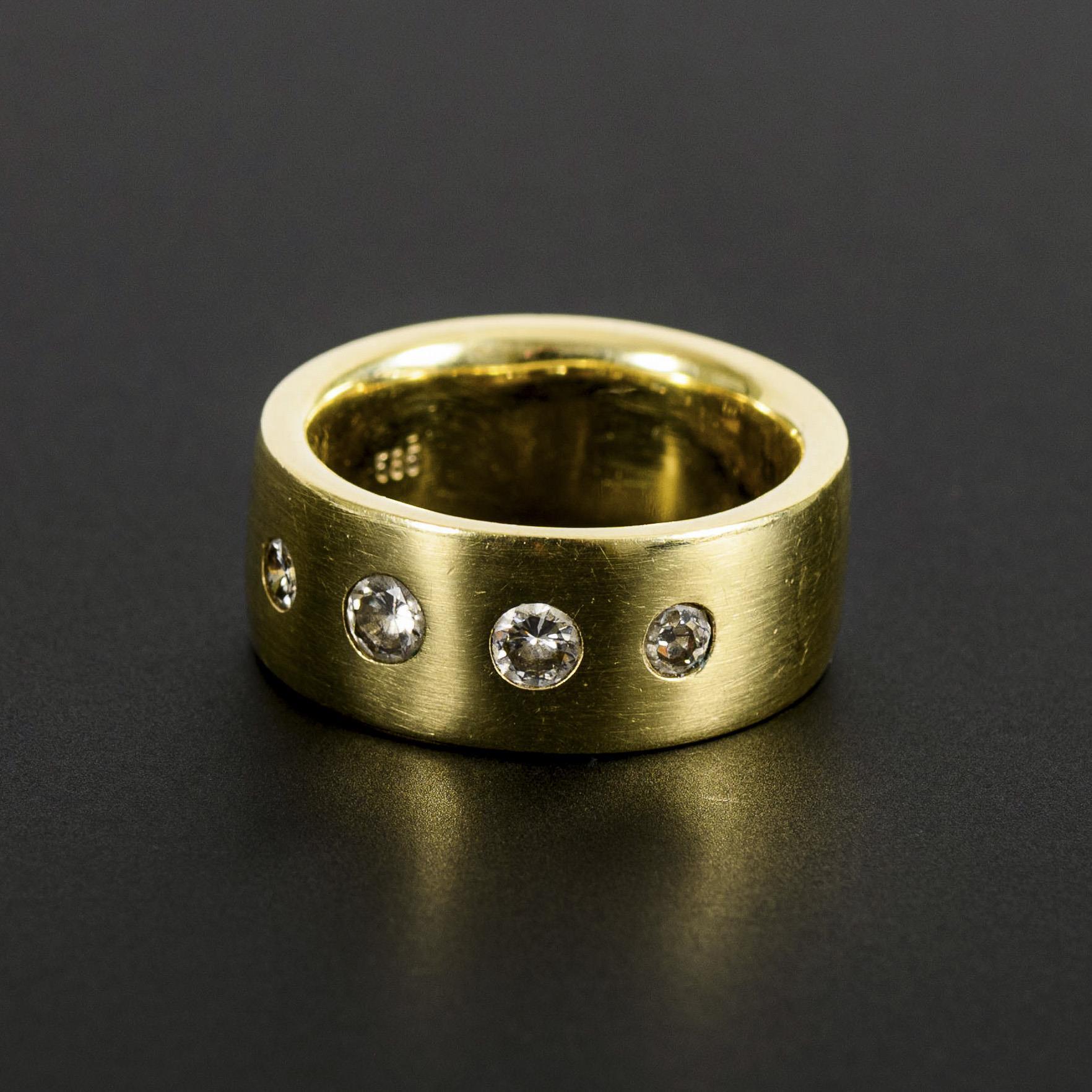 Massiv gearbeiteter Bandring mit 4 eingelassenen Brillanten. Leichte Tragespuren an der Unterseite.