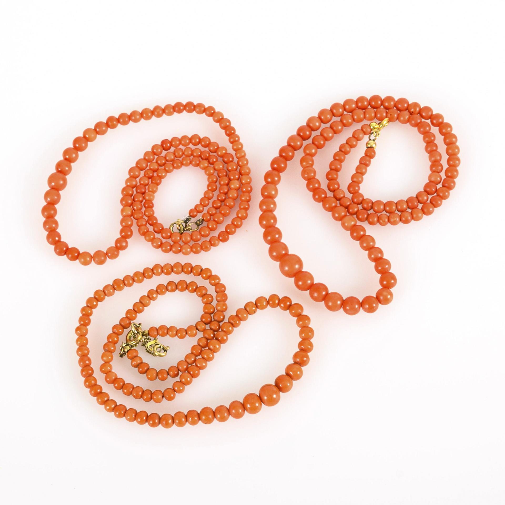 Koralle, Verschlüsse aus Doublé. Längen: 42, 47 und 49 cm. Zusammen 48,6 g.