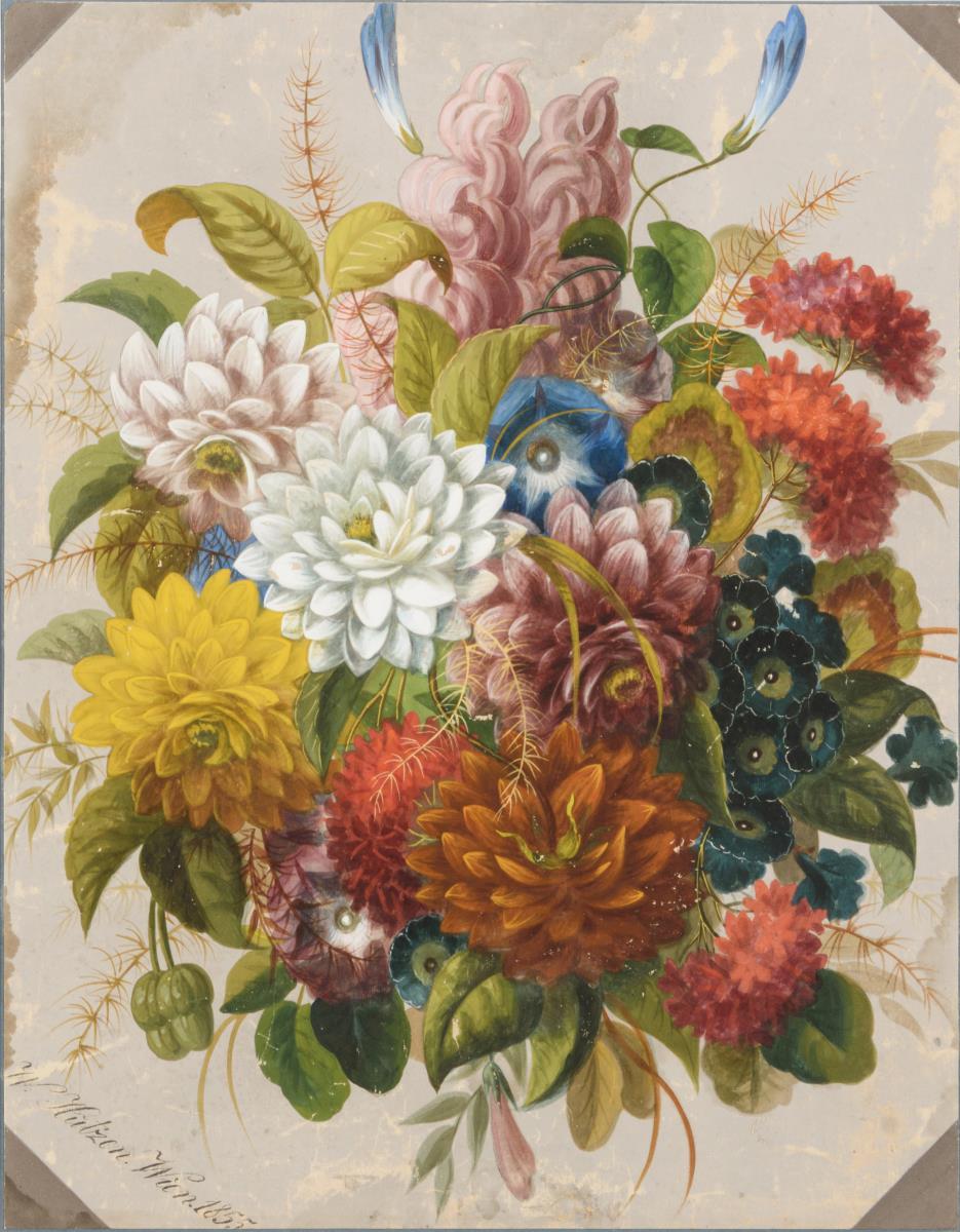 Stillleben mit Primeln, Dahlien und anderen Blumen. Altersspuren.