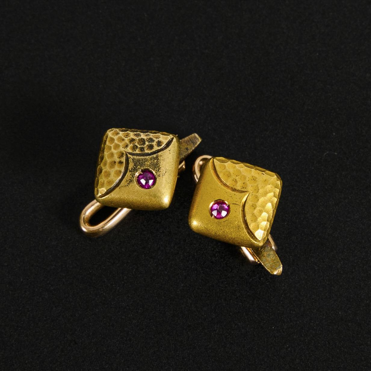 2 kleine, teilreliefierte Knöpfe mit rotem Farbstein am Kippknebel, in grünem Etui "Aug. Beckord Juwelier HERFORD Beckerstr. 15".