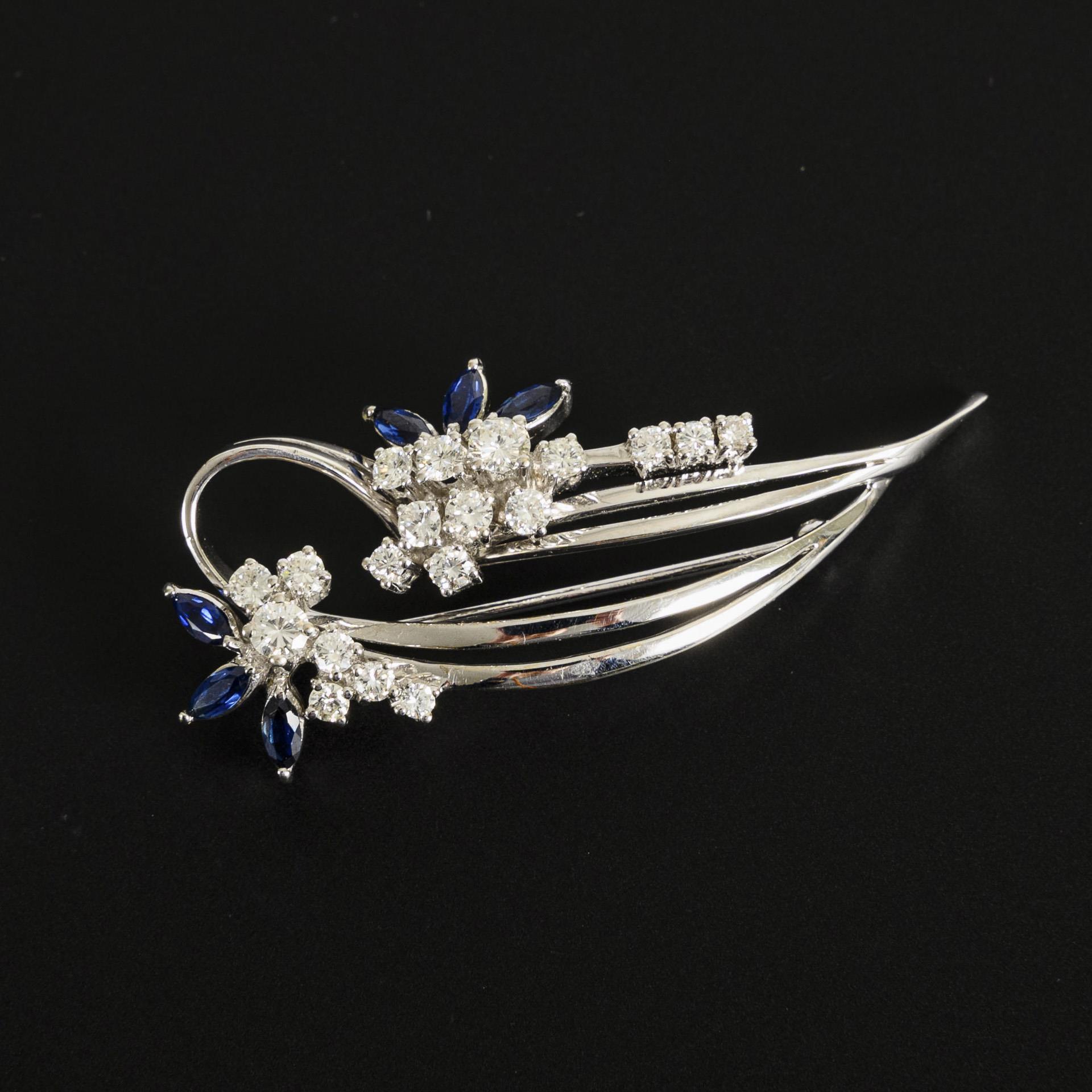 Schwungvoll-floral gestaltete Brosche mit 6 Saphiren und 19 Brillanten.