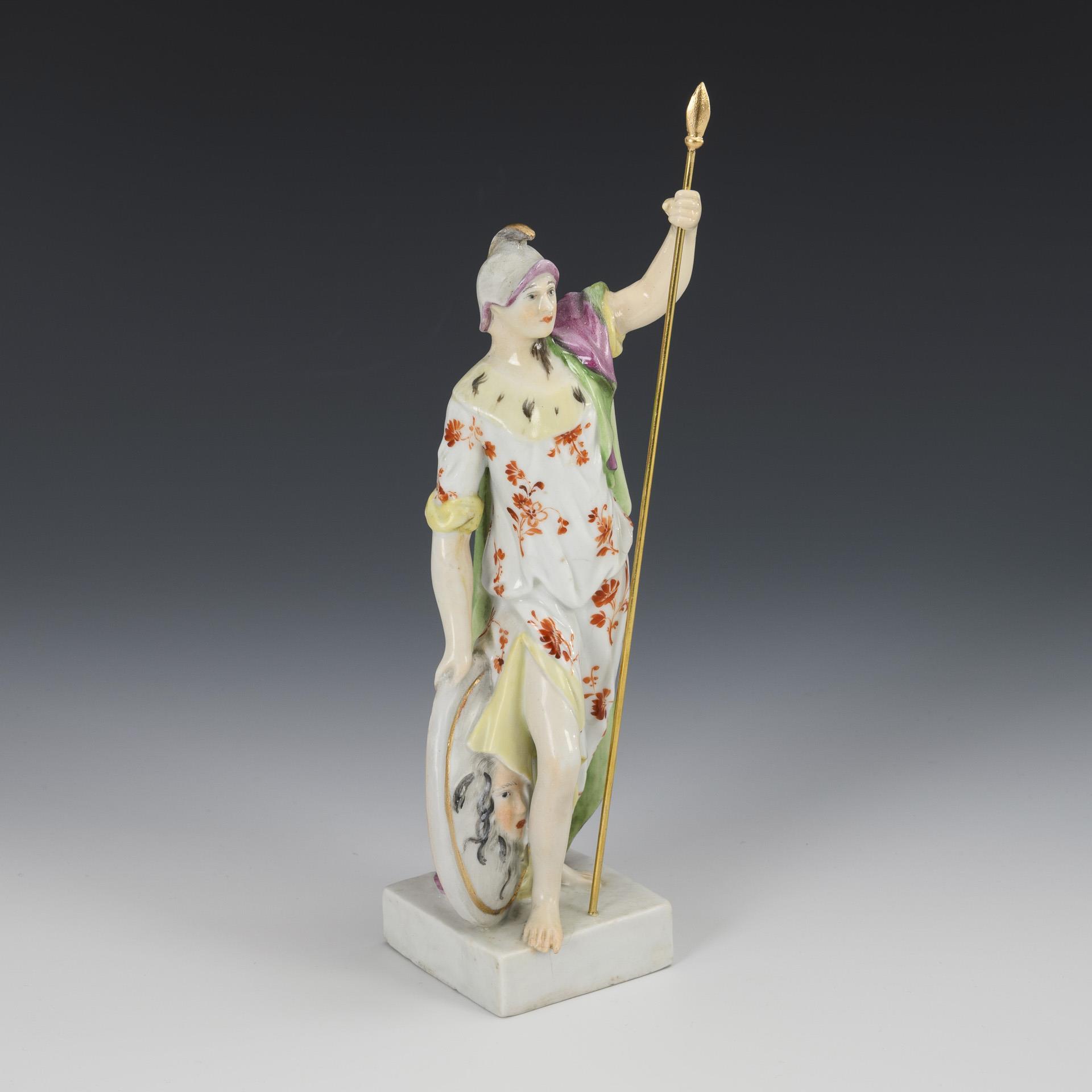 Stehende Figur der Göttin mit Helm, Medusenschild und Metallstab. Schild, rechter Fuß, linker Arm und Helm restauriert.
