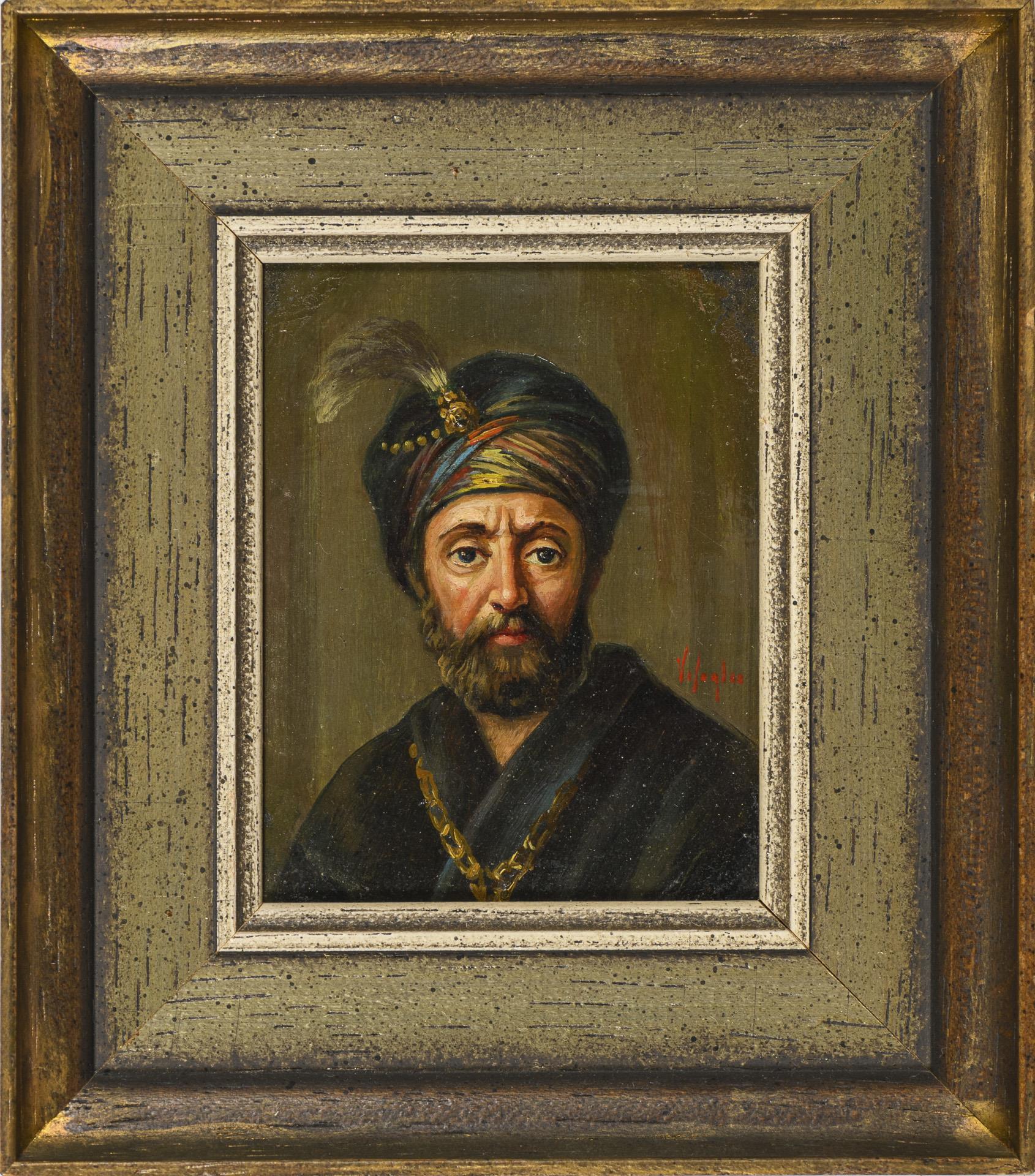 Porträt eines orientalischen Mannes mit Vollbart und Turban vor neutralem Hintergrund.