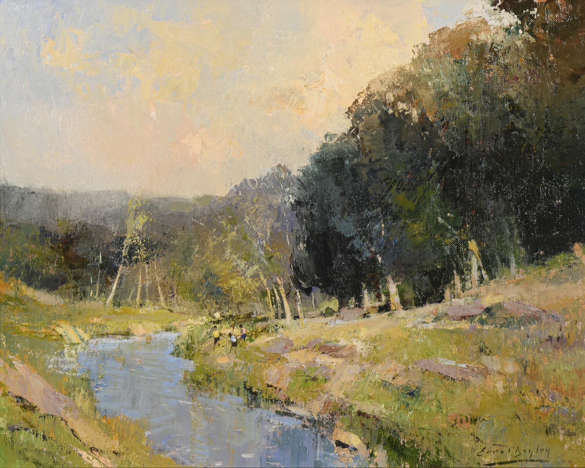Helles Sonnenlicht über der Flussbiegung mit den spielenden Kindern am Ufer vor dem Waldrand.