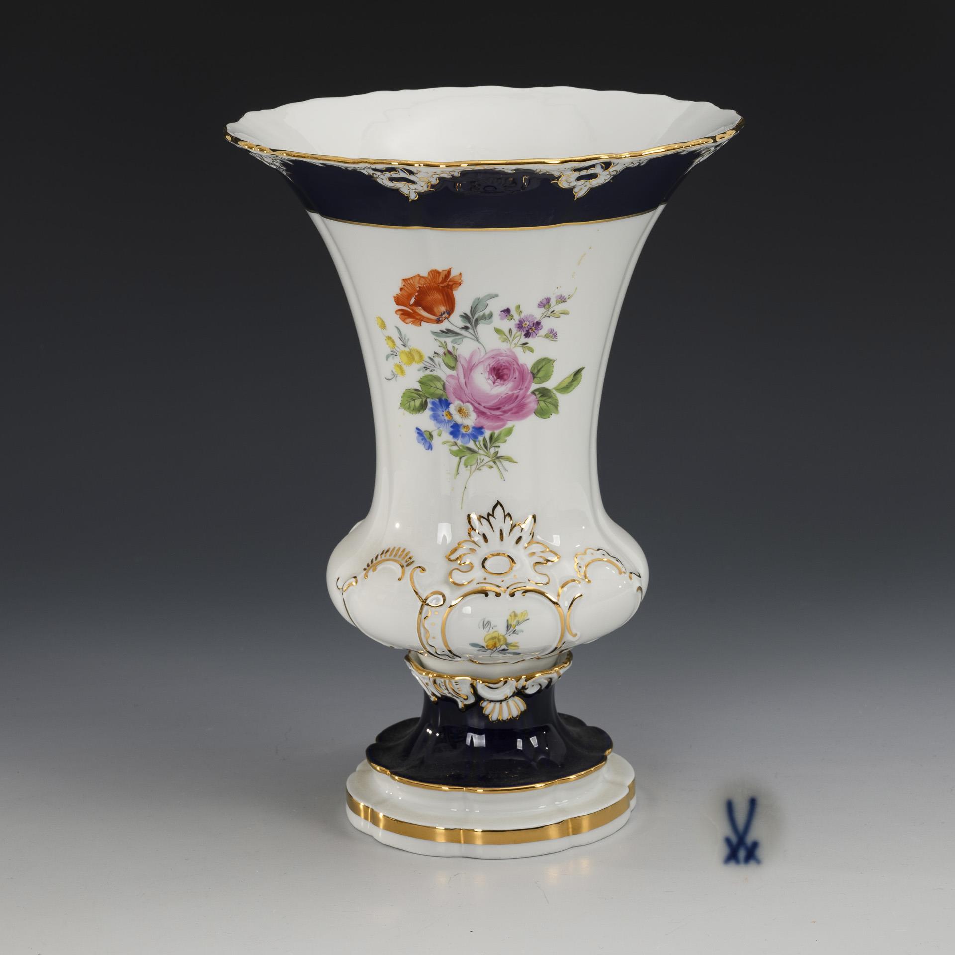 Kobaltblauer Teilfond, polychrome Blumenmalerei, Goldstaffage. H 25,5 cm.