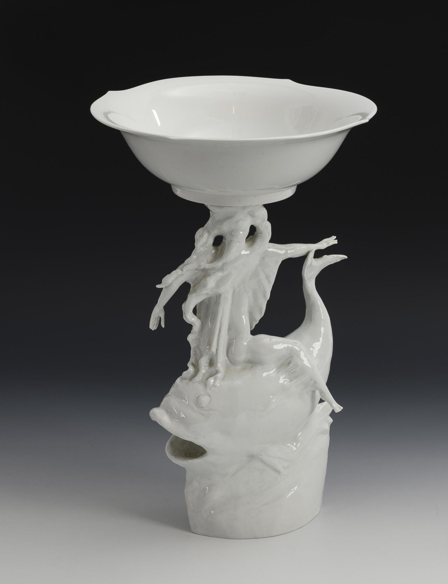 Tafelaufsatz zum Service "Wellenspiel". Auf einem Walfisch reitender Frauenakt, auf dem Kopf eine Schale tragend.