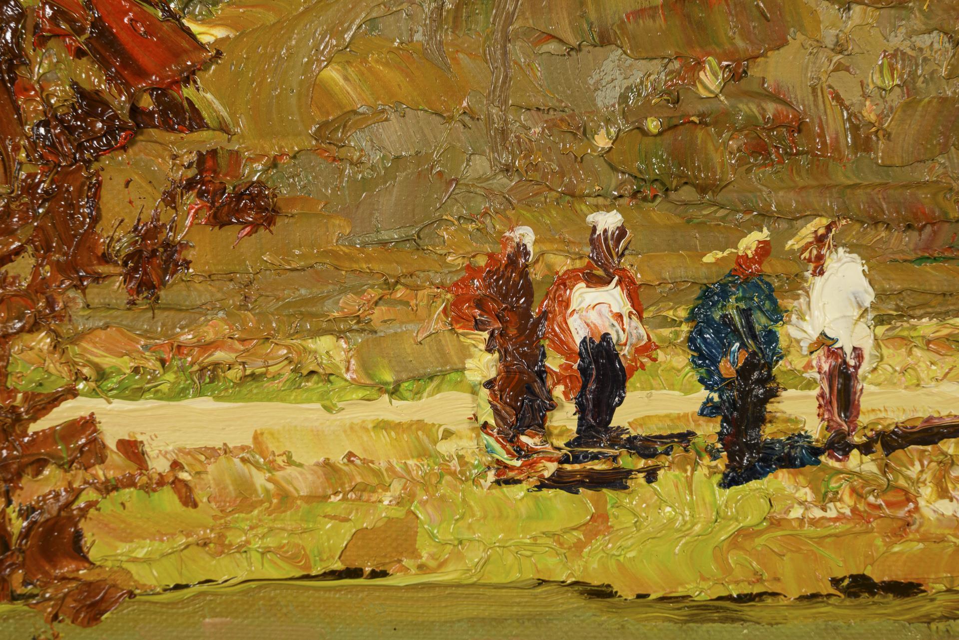Herbstliche Landschaft mit Personen auf einem Weg nahe dem Flussufer.