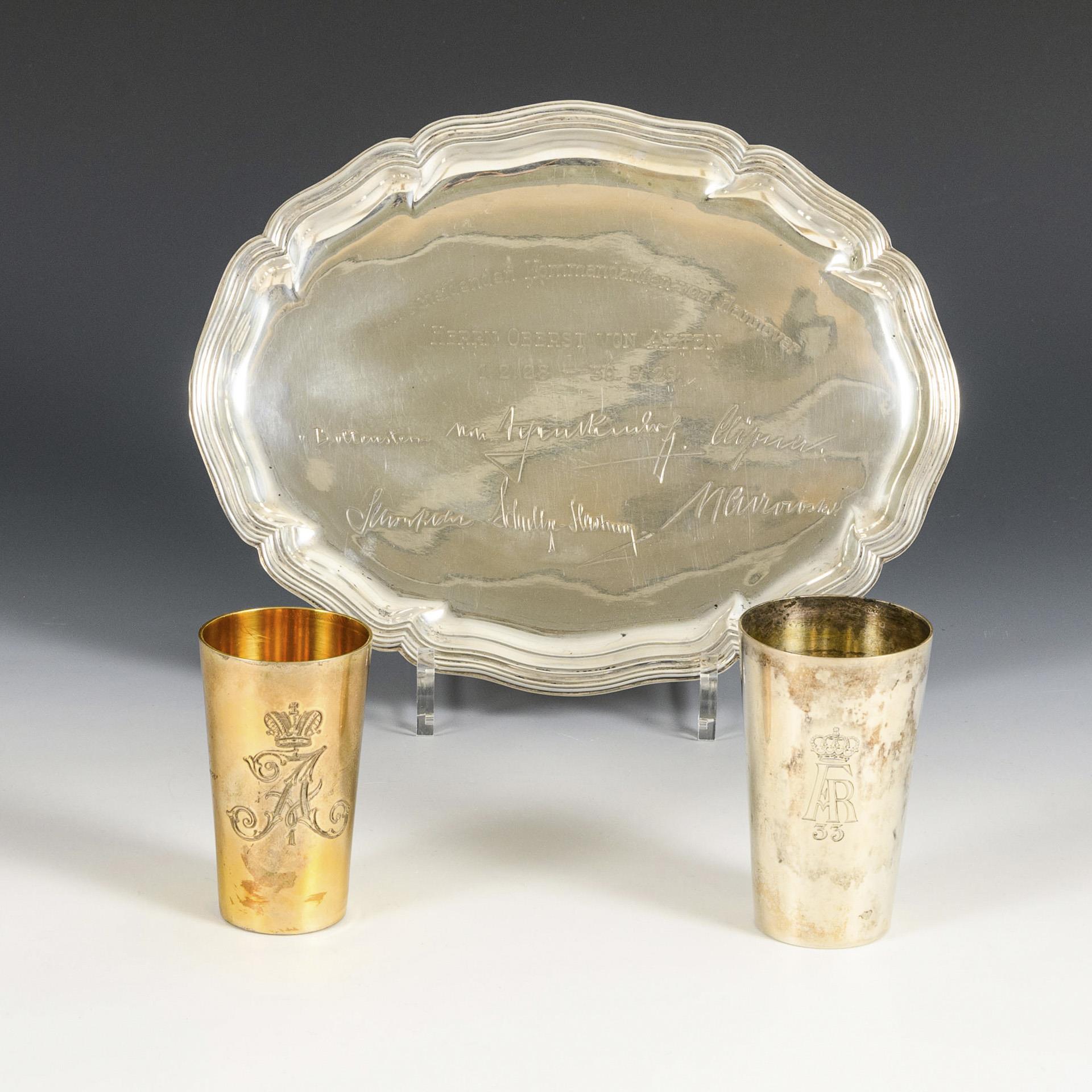 2 silberne Regiments-Becher und kleines Regiments-Tablett mit Widmung: Vergoldeter Becher des Kaiser Alexander Garde-Grenadier-Regiments Nr. 1, mit gravierter Namensliste und Datierung "1896" (H 9,5 cm). / Regimentsbecher "FMR 33" mit Krone, verso bezeichnet "Oberwachtm. Nolte 1935-36" (H 10 cm). / Ovales Tablett mit Widmungsgravur: "Dem scheidenden Kommandanten von Hannover Herrn Oberst von Alten, 1.2. 28 - 30.9. 29" (21,5 x 27,5 cm). Alle Teile gedellt, Tablett mit einigen Kratzern.