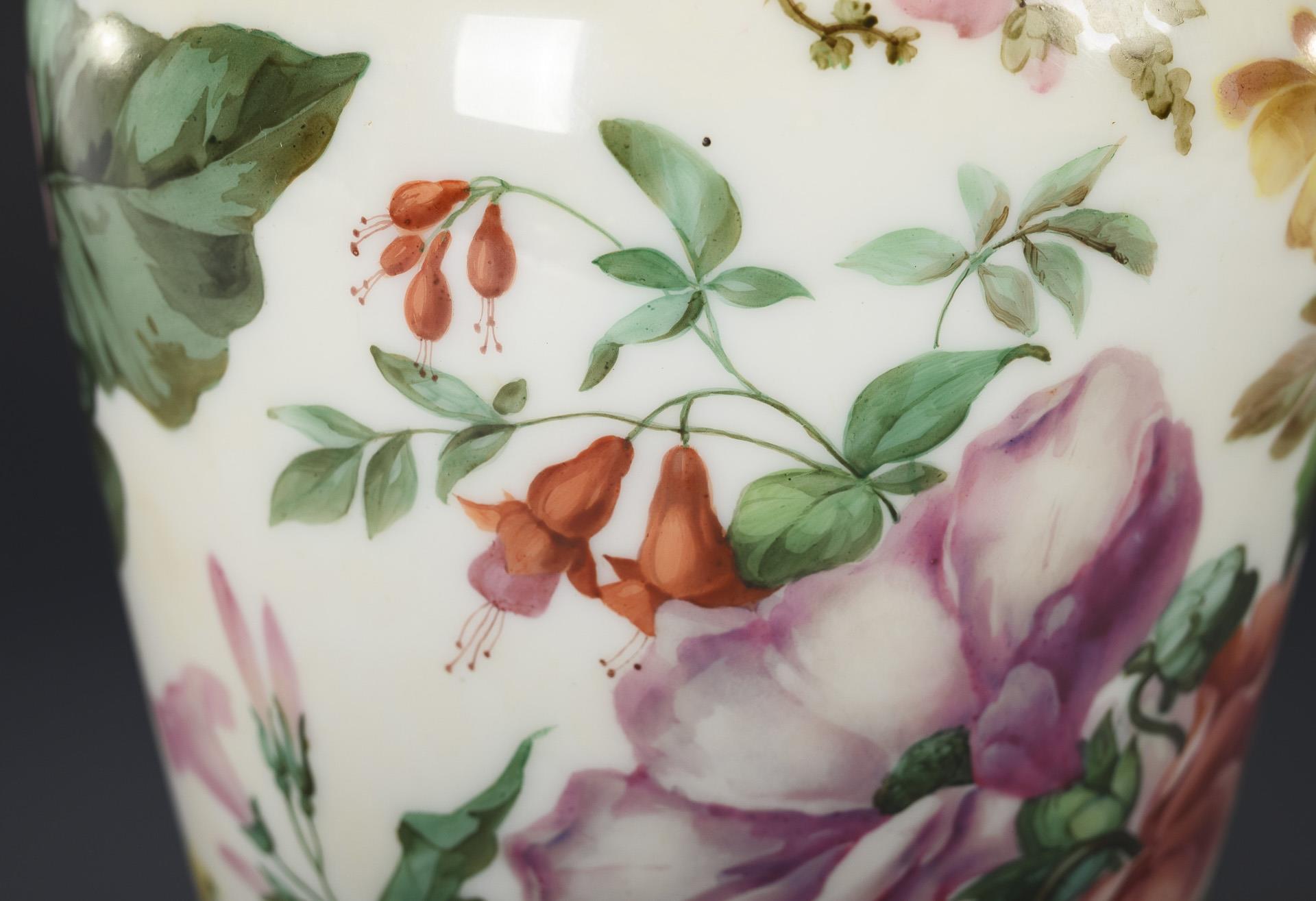 Balustervase mit Kraterhals und Rundfuß. Umlaufend reiche Blumenmalerei. Gold teils berieben.