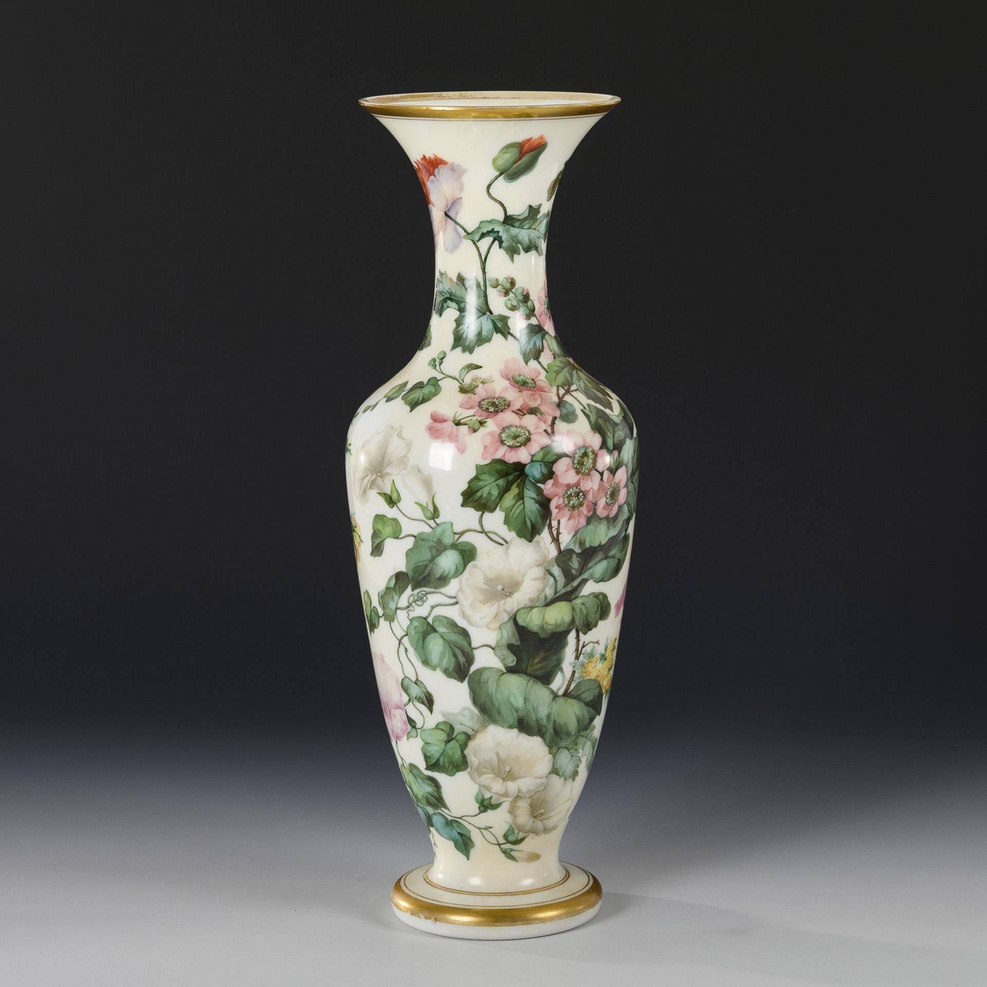 Weißes Milchglas, polychrome Emailmalerei, Goldstaffage. H 43,5 cm.
