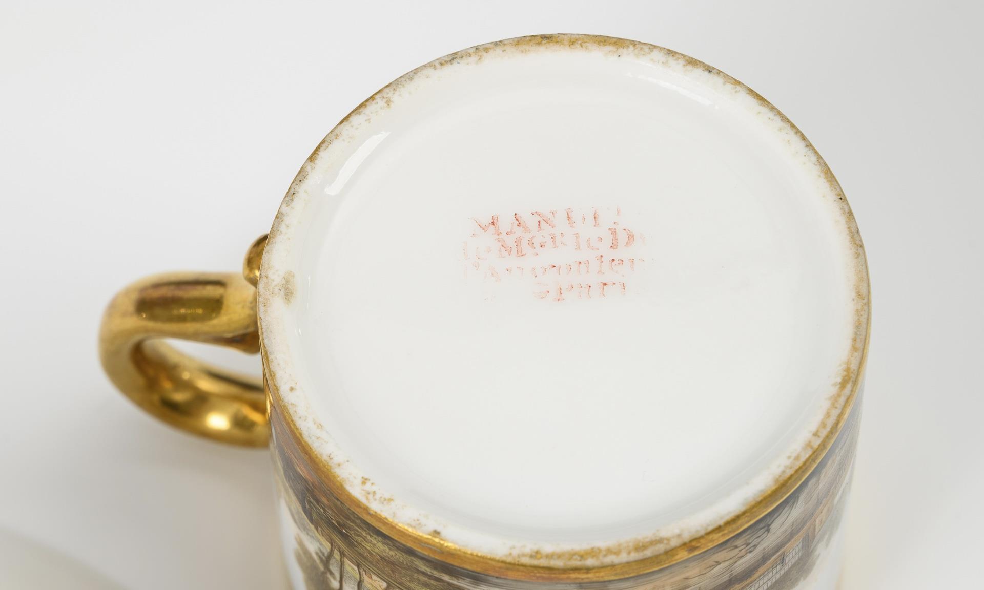 Polychrom bemalt, goldstaffiert. Tasse (H 5,5 cm), Untertasse (Ø 11,5 cm).