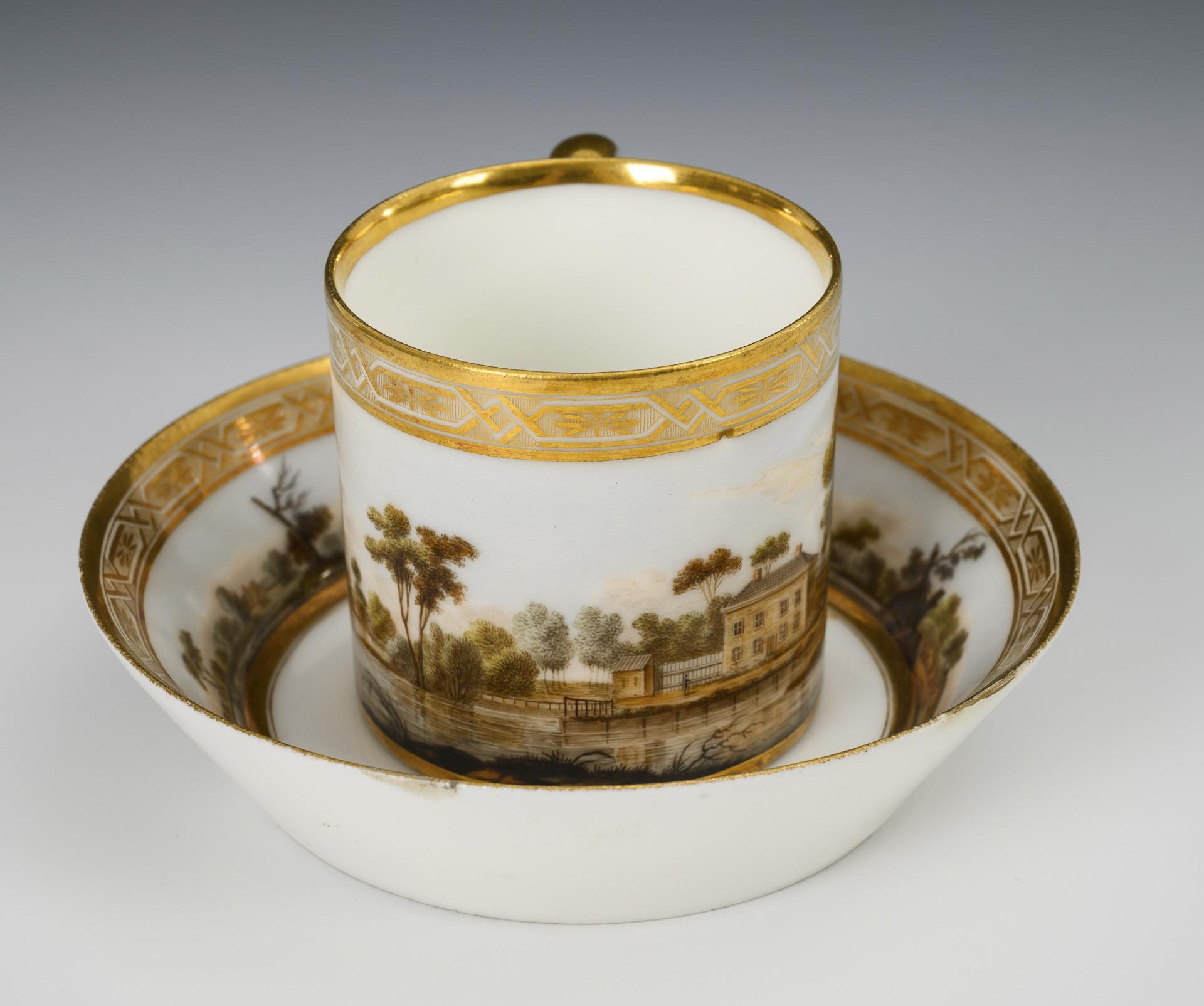 Zylindertasse mit Ohrenhenkel. Unter einer ornamentalen Goldbordüre die umlaufende Darstellung einer Landschaft mit Architektur und Personenstaffage.
