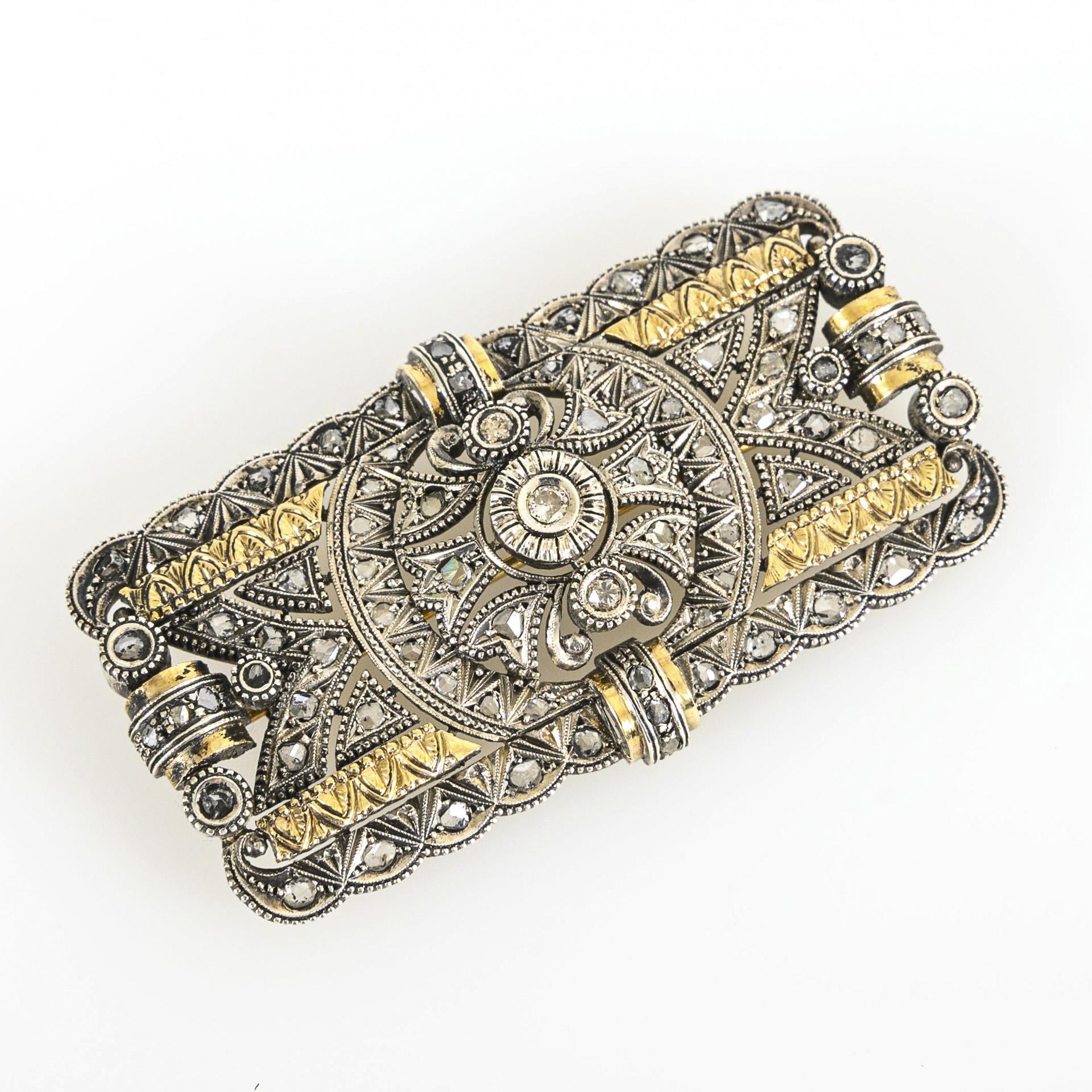 Brosche in Silber (teilvergoldet), mit Besatz aus 3 Altschliff-Brillanten sowie Achtkant-Diamanten.