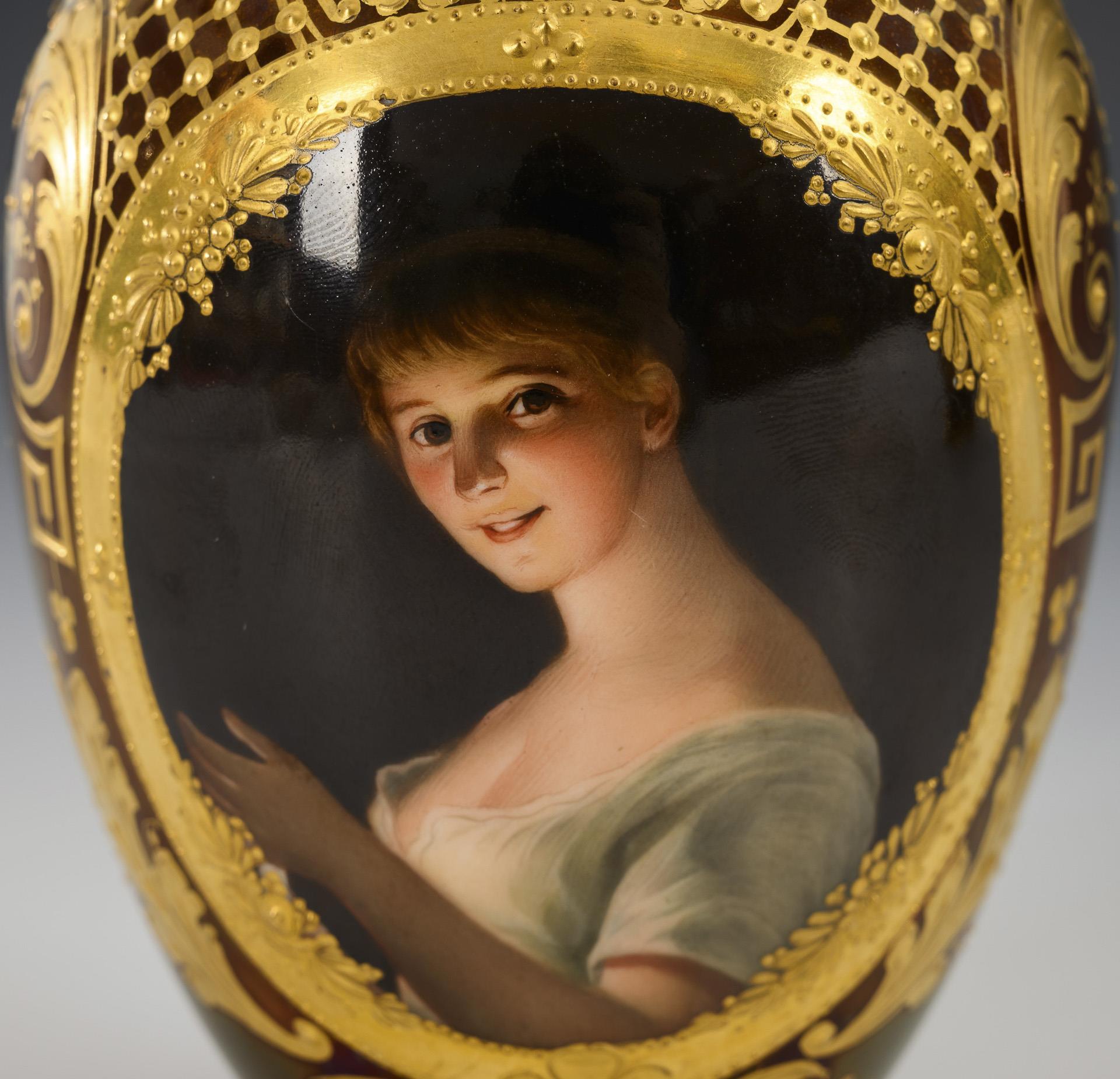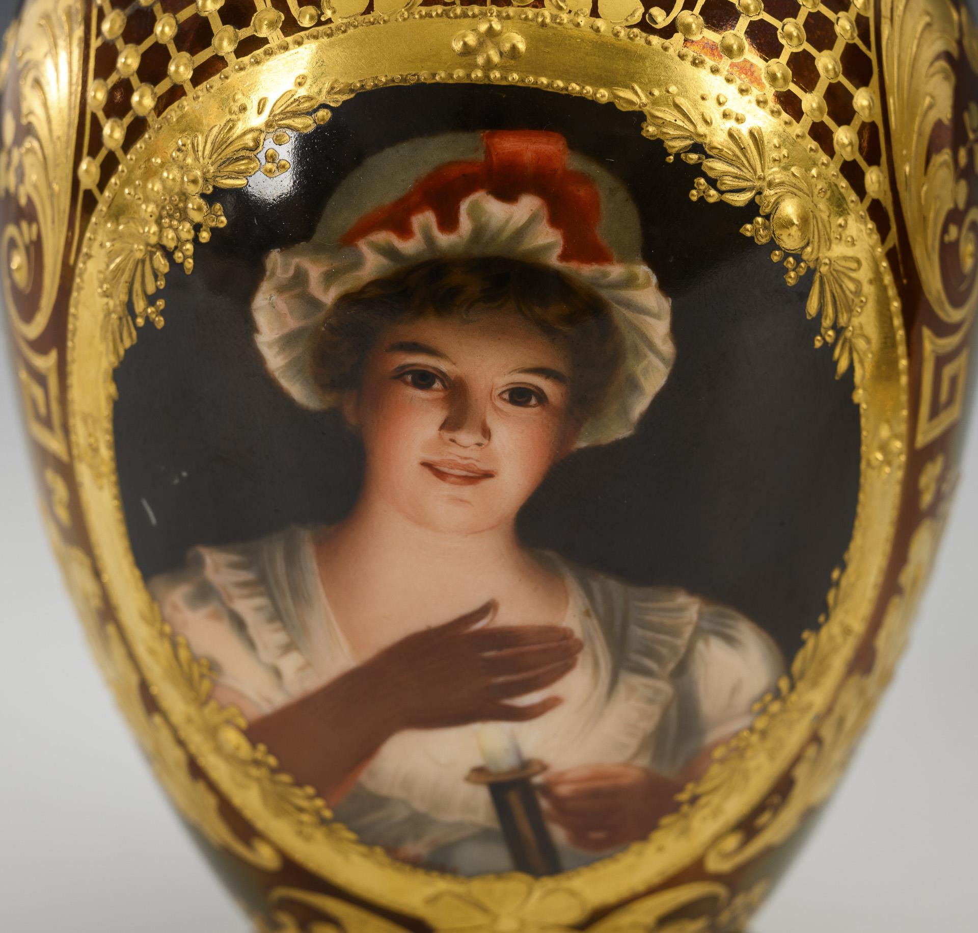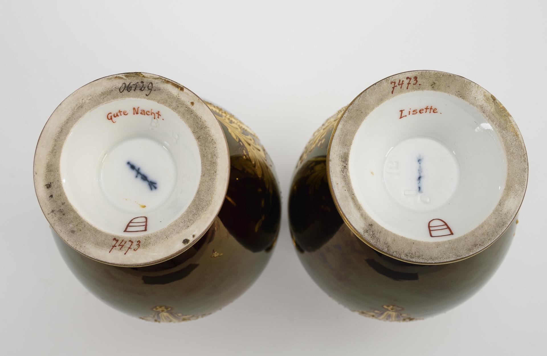 Balustervasen mit Kraterhals und Rundfuß. Brauner, lüstrierter Fond mit feiner floral-ornamentaler Reliefgoldmalerei. Schauseitig eine Ovalkartusche mit der zwei verschiedenen Porträts einer Dame mit Nachtlicht, nach den Gemälden "Gute Nacht" und "Lisette" von Georg Horn (1838-1911), unterseitig bezeichnet. Beide Füße restauriert.