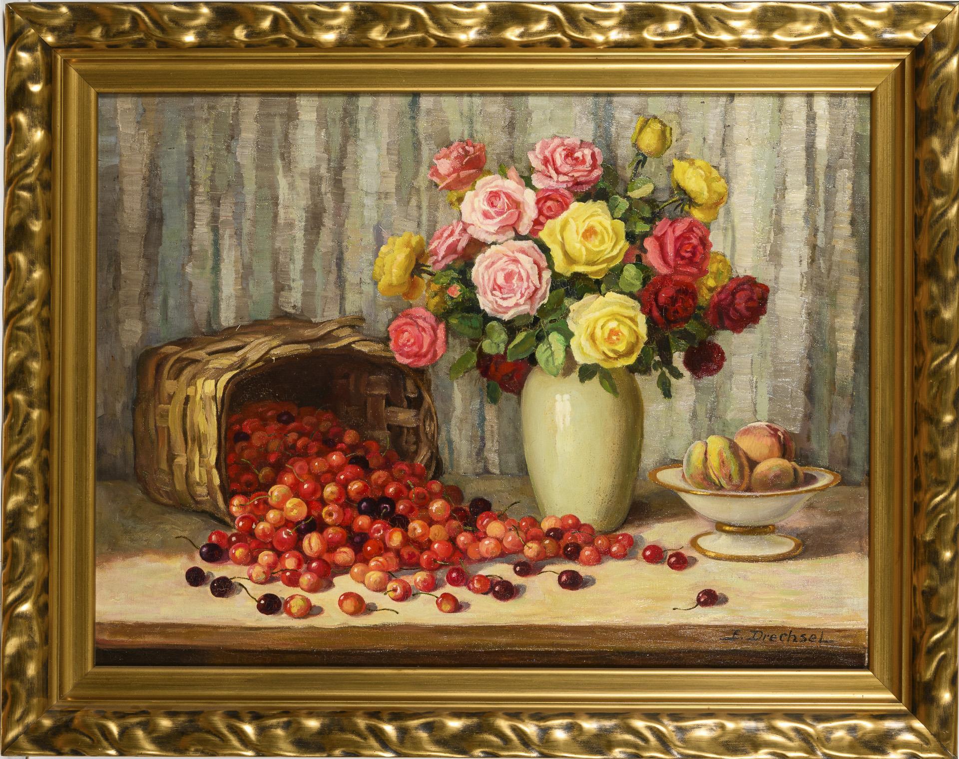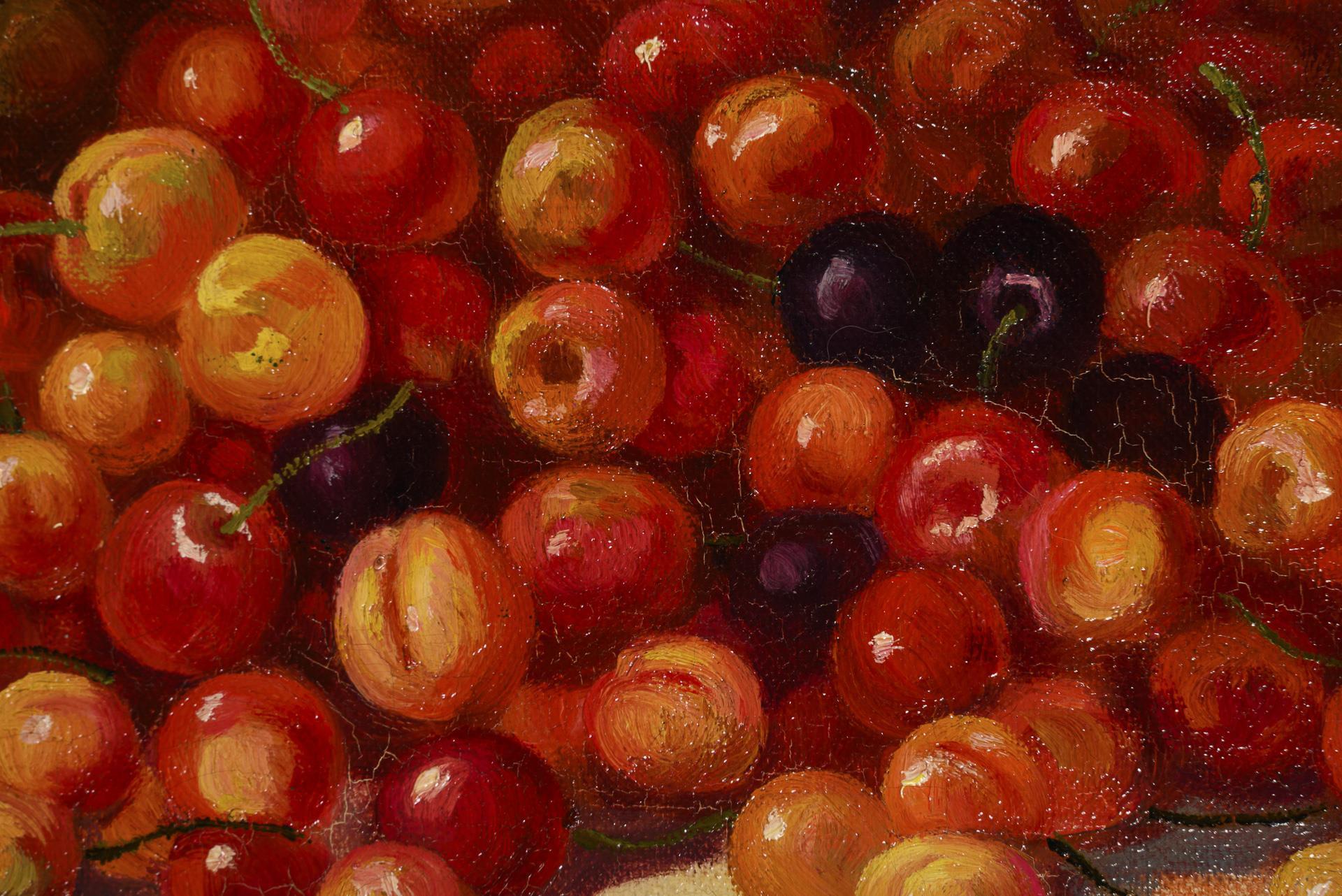 Kirschen vor einem gekippten Korb neben einem Rosenstrauß und einer Schale mit Pfirsichen.
