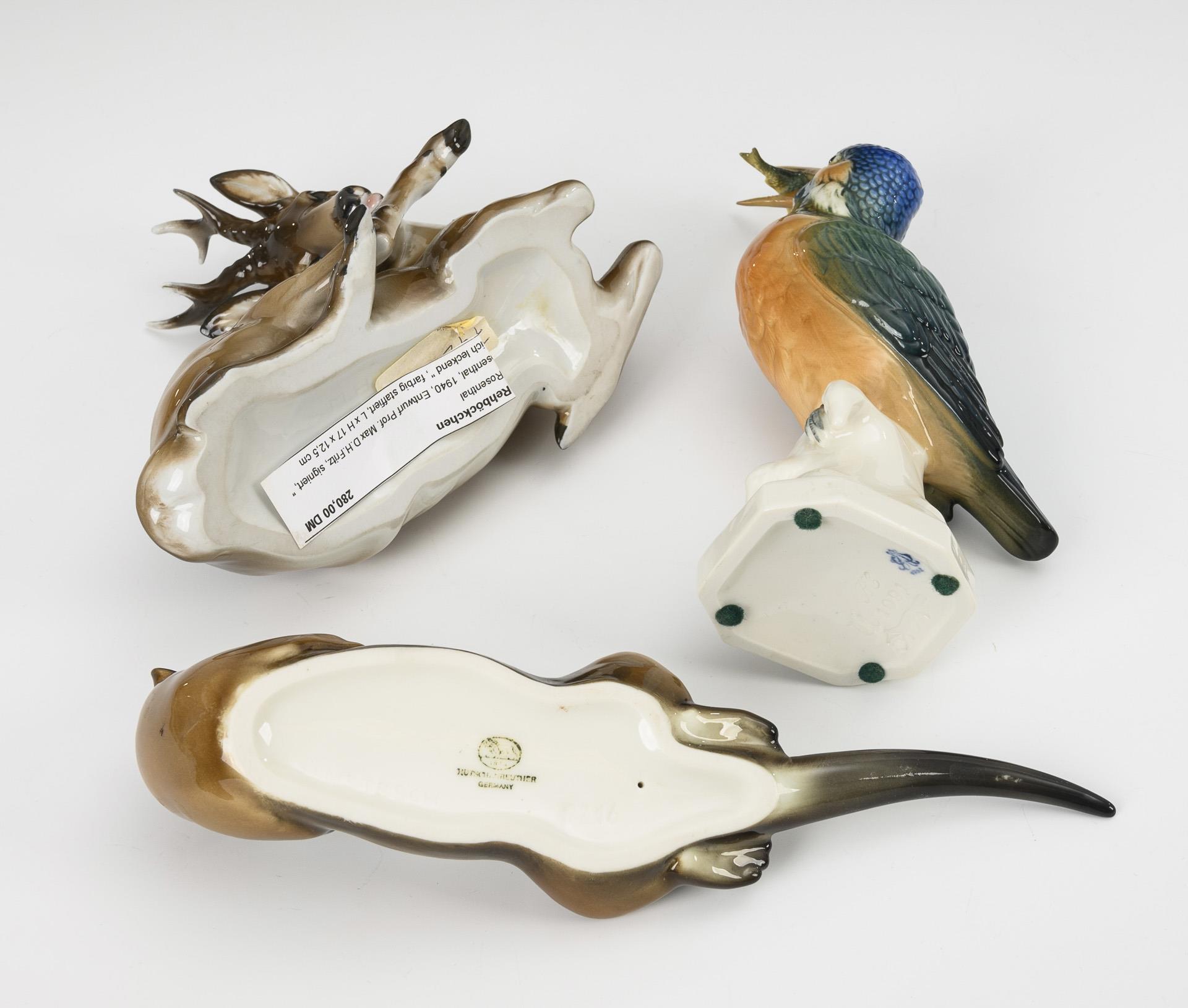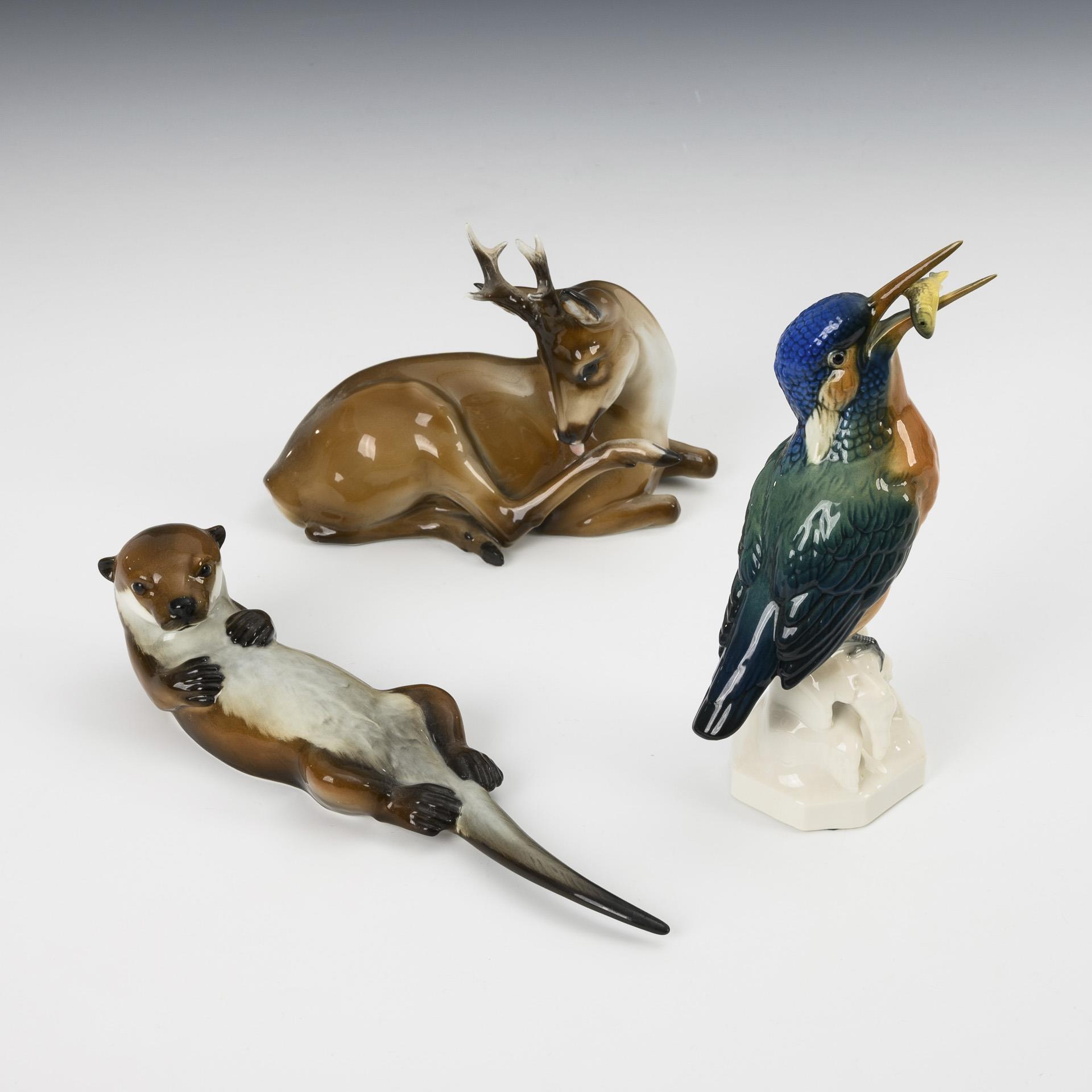 1x ROSENTHAL, Modell-Nr. 981, Entwurf von Max D.H. Fritz (1873-1948): liegender, sich den Hinterlauf putzender Rehbock (H 12,5 cm). / 1x HUTSCHENREUTHER, Modell-Nr. 9216, Entwurf von Uwe Netzsch (*1944): auf dem Rücken liegender Fischotter (L 23 cm). / 1x AELTESTE VOLKSTEDTER, Modell-Nr. U 1091, nach einem Modell der Schwarzburger Werkstätten, Entwurf 1916 von Edmund Sode (1856-1922); Auf einem Eissockel sitzender Eisvogel mit Fisch (H 19 cm). 1 Gehörnspitze des Rehbocks restauriert.