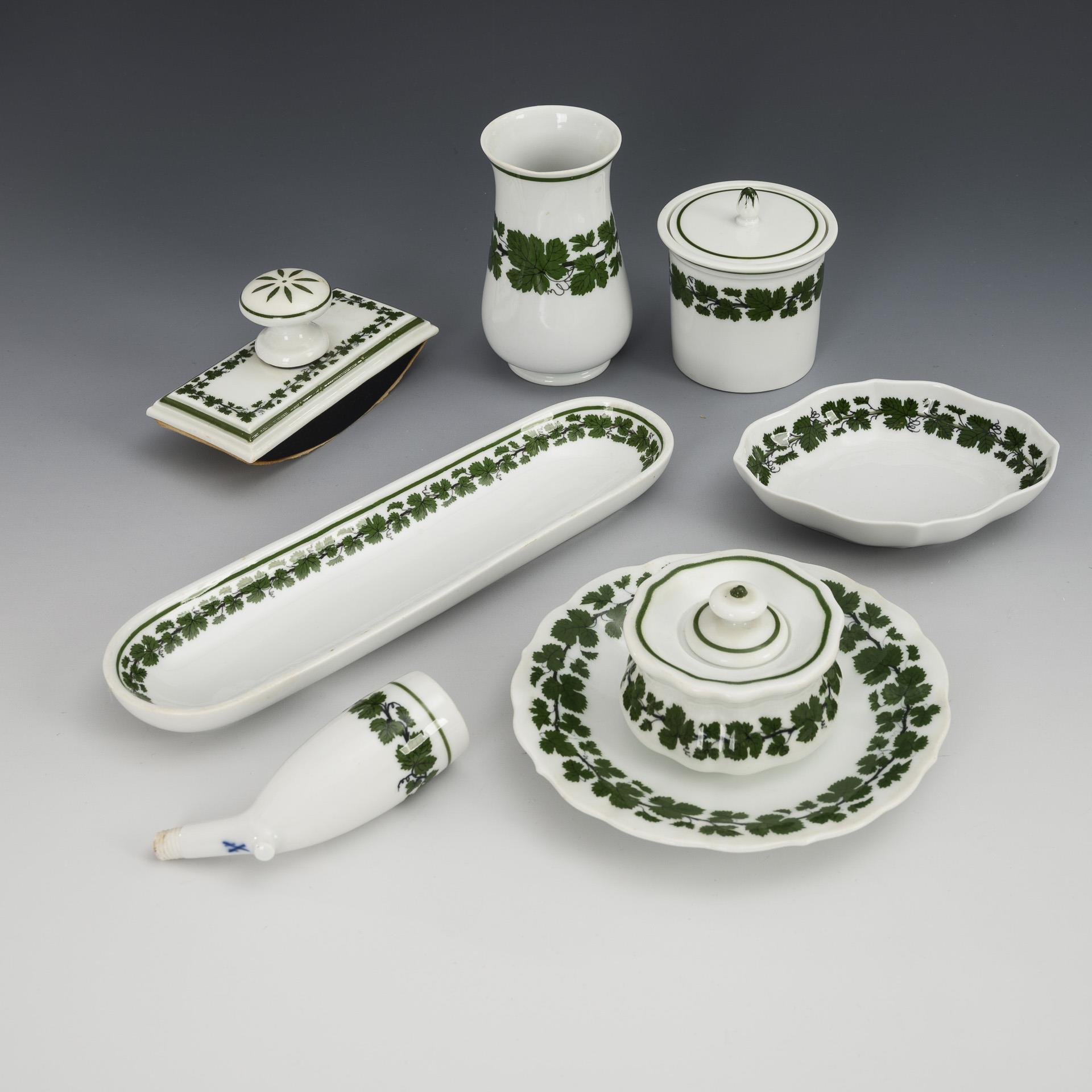 Federschale (L 23,5 cm), Untertasse (Ø 14,5 cm), Löschwiege (L 11 cm), Tintenfass (H 5 cm), Zylinderdose (H 7,5 cm), Pfeifenkopf (L 10 cm), Vierpassschälchen (L 12,5 cm) und Vase (H 10 cm). Chip am Deckelrand der Zylinderdose.
