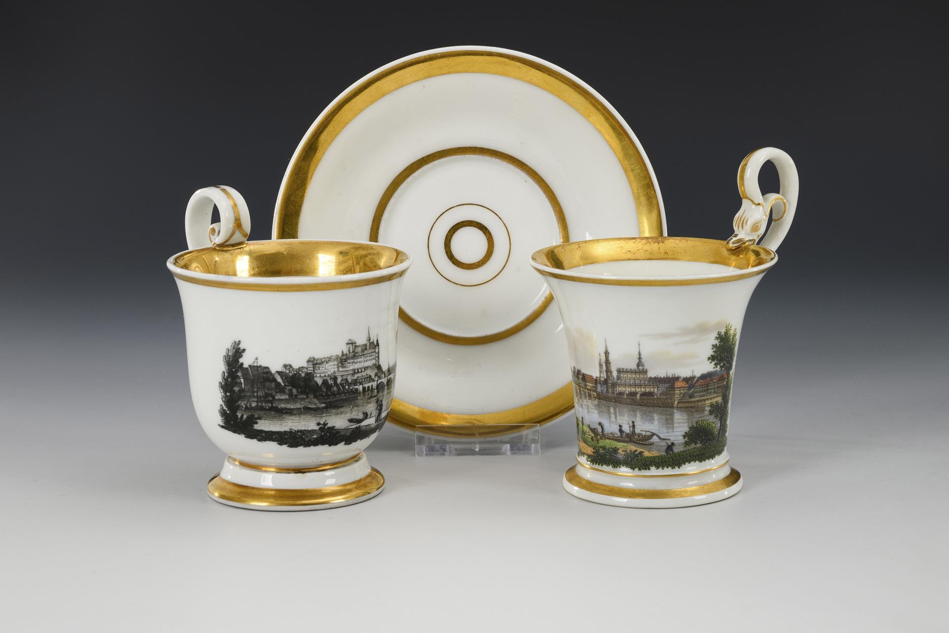 1x gefußte Glockentasse (H 9,5 cm) mit Blatthenkel und der Ansicht von Meißen, mit ergänzter Untertasse (Ø 13 cm). / 1x Kratertasse (H 10,5 cm) mit Schwanenhenkel und der Ansicht von Dresden, ohne Untertasse. 1x Randrestaurierung und Restaurierung am oberen Henkelansatz.
