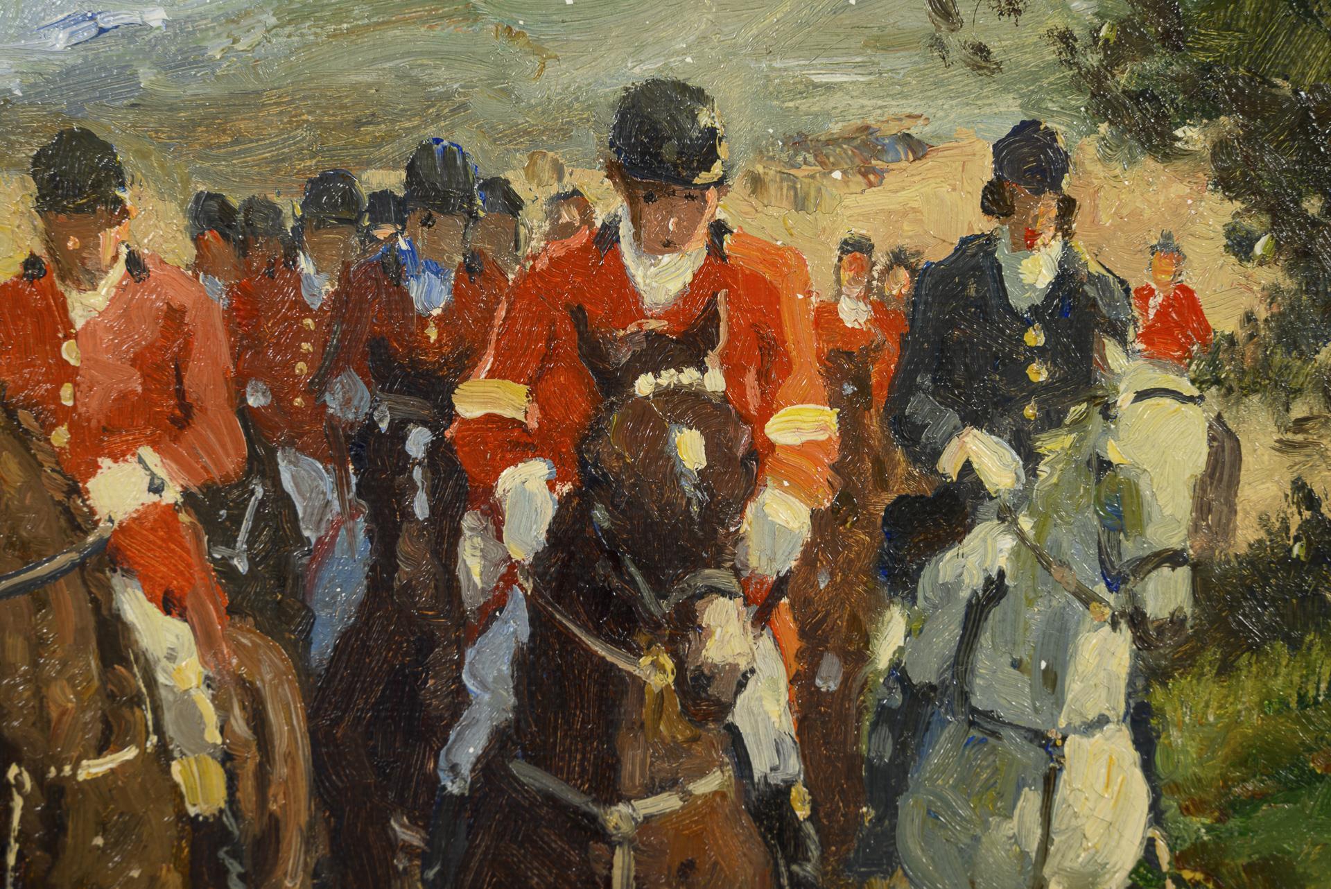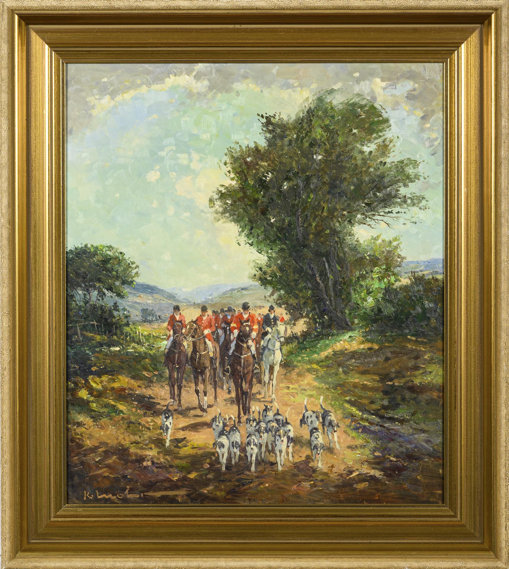 Die Reiter in den klassischen rot-weißen Uniformen mit den Hunden auf einem Weg zur Jagd.