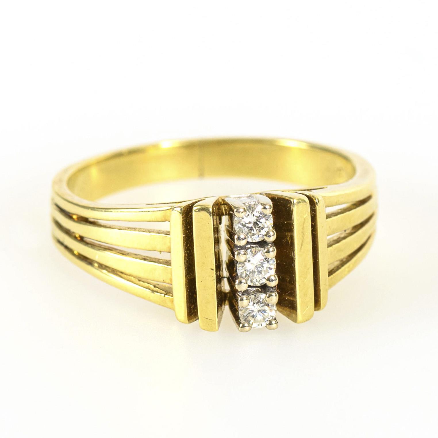 Ringkopf mit 3 chatongefassten Brillanten an breiter, viergliedrig gearbeiteter Ringschiene.