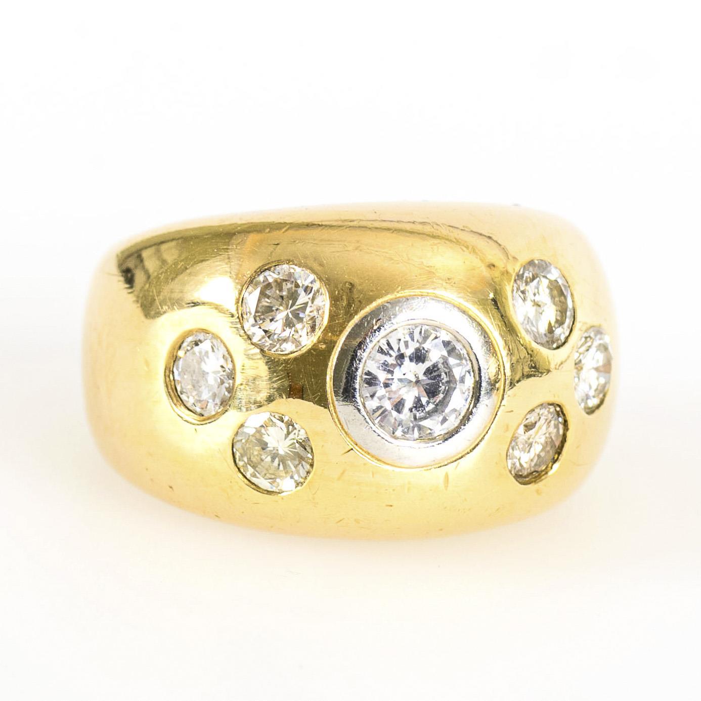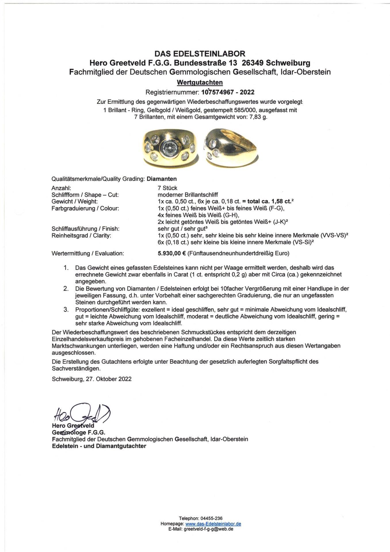 Gelbgold 585 gestempelt. Brillanten zusammen ca. 1,58 ct/J-K/vvs-vs/vs-si. Ringgröße 50. 7,8 g.