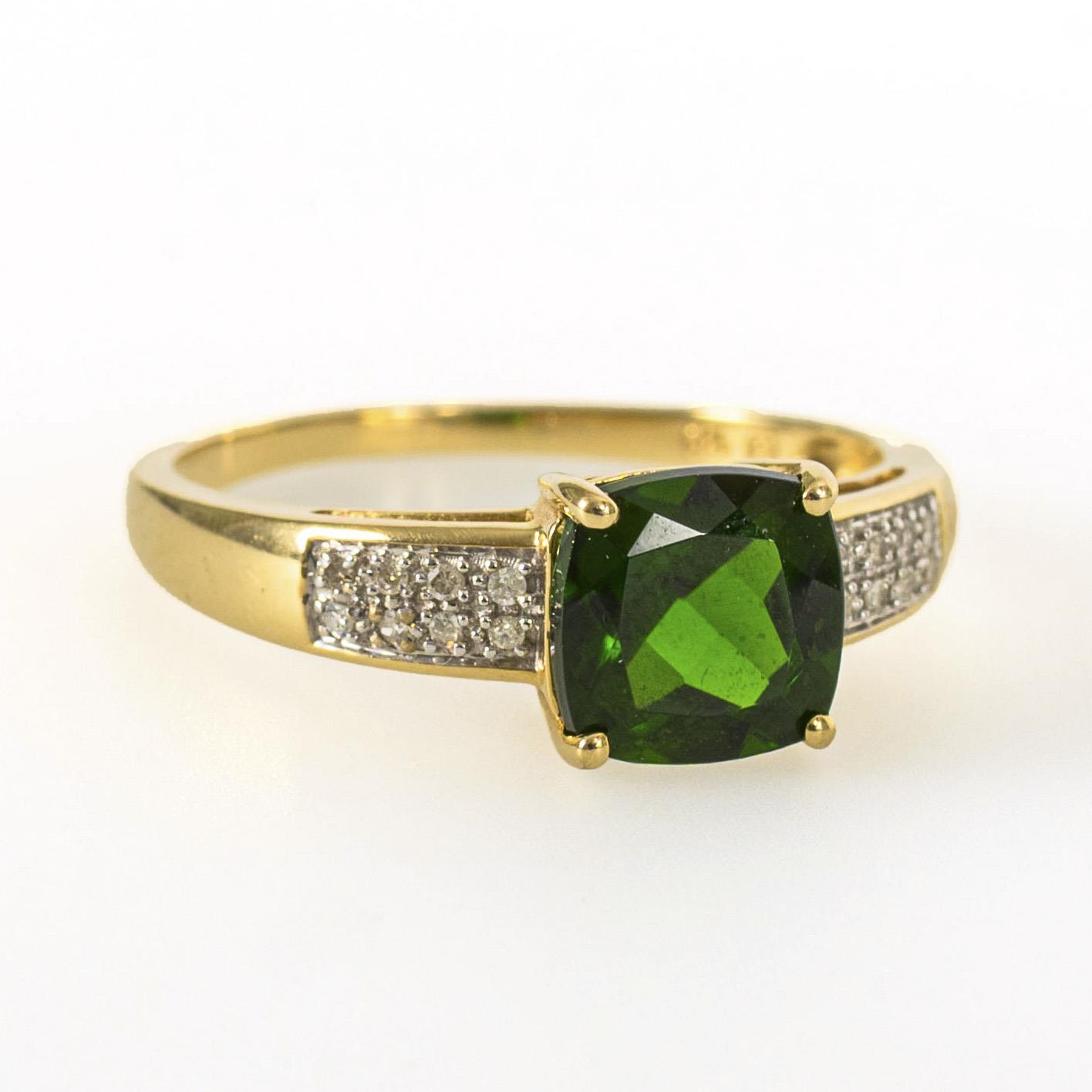 Gelbgold 585 gestempelt. Diopsid ca. 1,90 ct. Diamanten 8/8 zusammen ca. 0,05 ct. Ringgröße 59. 2,8 g.