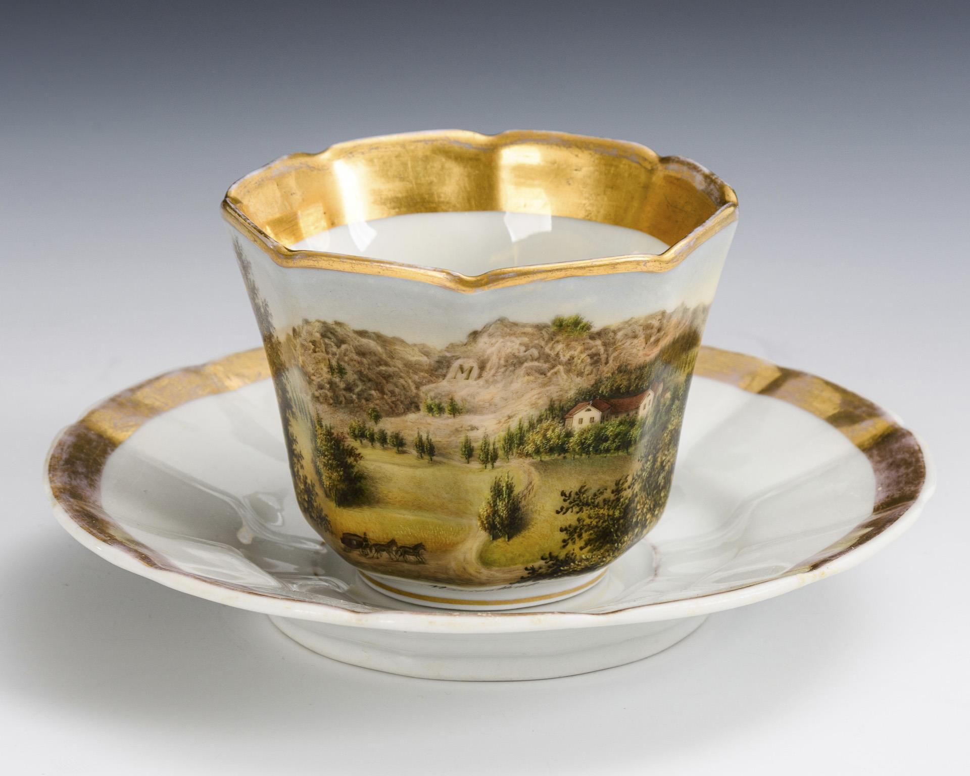 Polychrom bemalt, goldstaffiert. Tasse (H 6,5 cm), ergänzte Untertasse (Ø 15 cm).