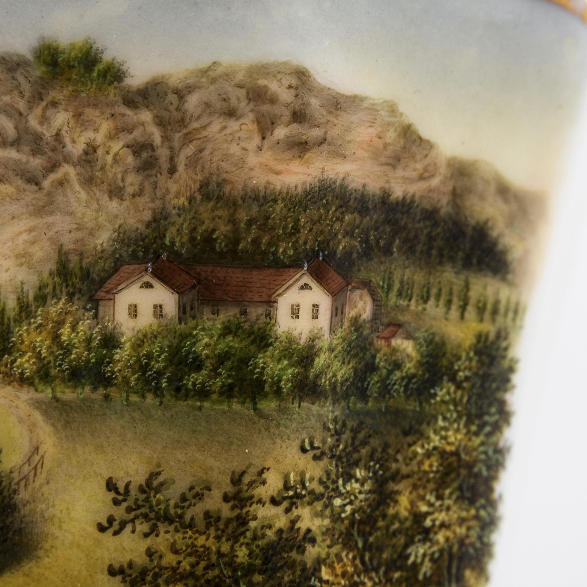 Polygonal-konische Tasse mit spitz geschwungenem Henkel. Schauseitig die Ansicht des Marientales bei Eisenach. Partieller Goldabrieb.