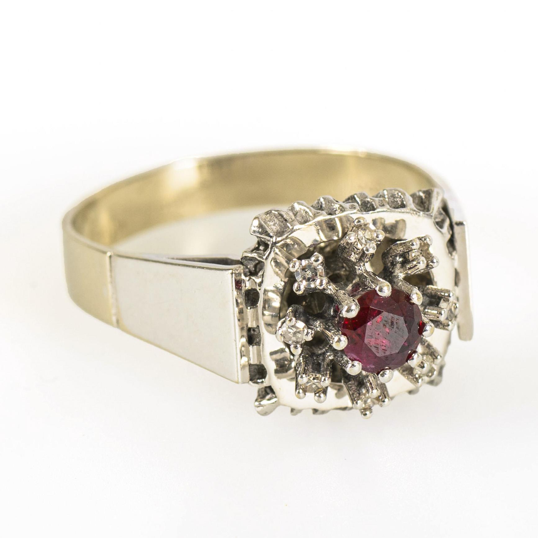 Ring mit zehn kleinen Brillanten und einem Rubin.
