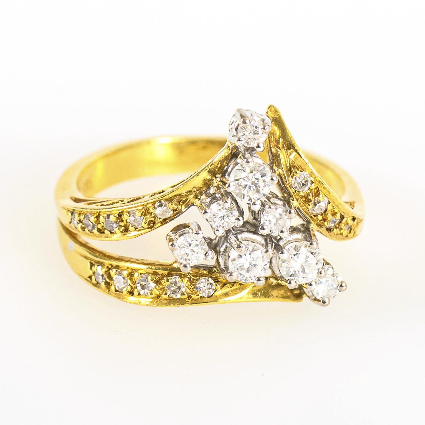 Gelbgold 585 gestempelt, die Brillanten mit 0.55 (kt) gestempelt. Ringgröße 53. 4,3 g.