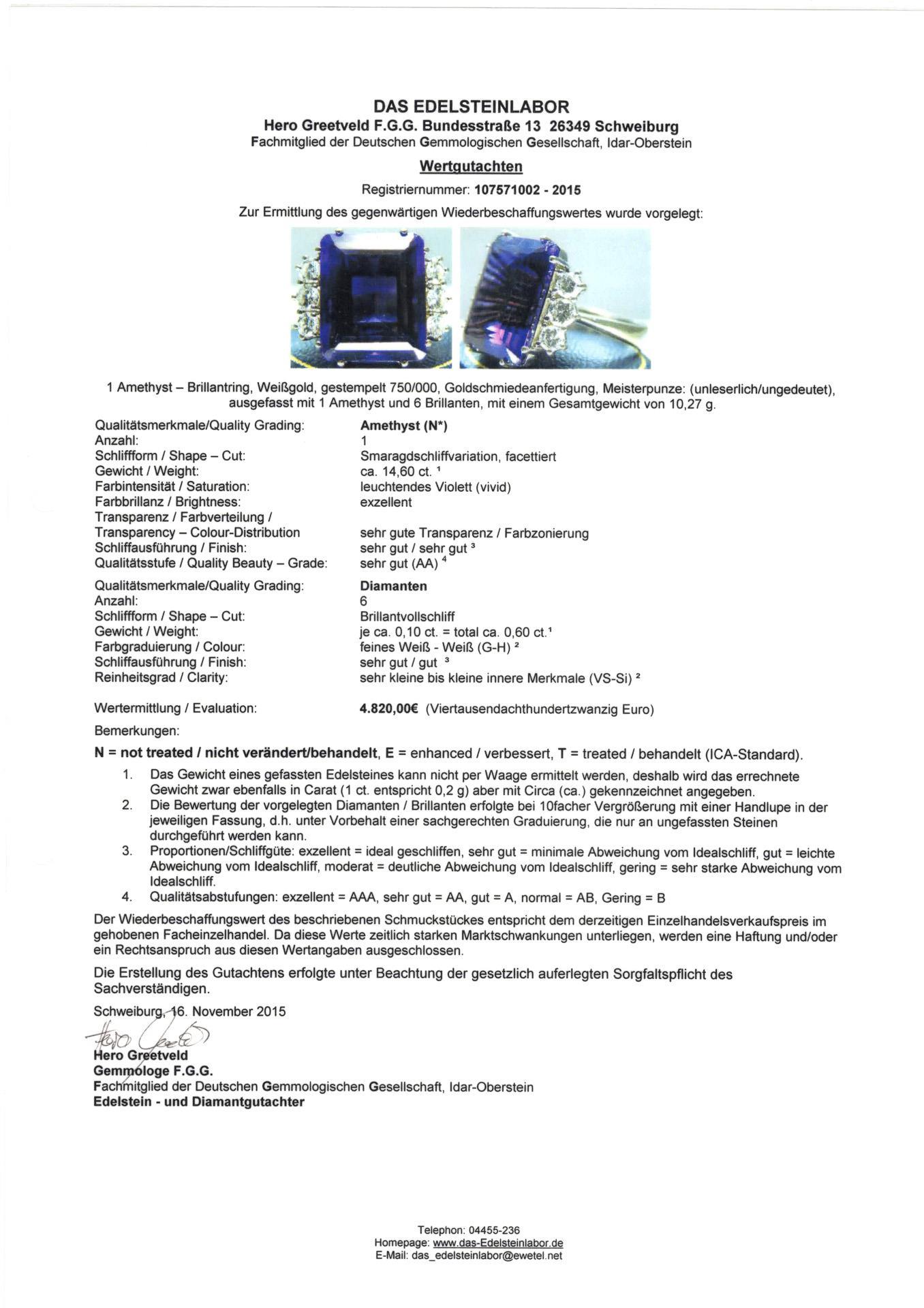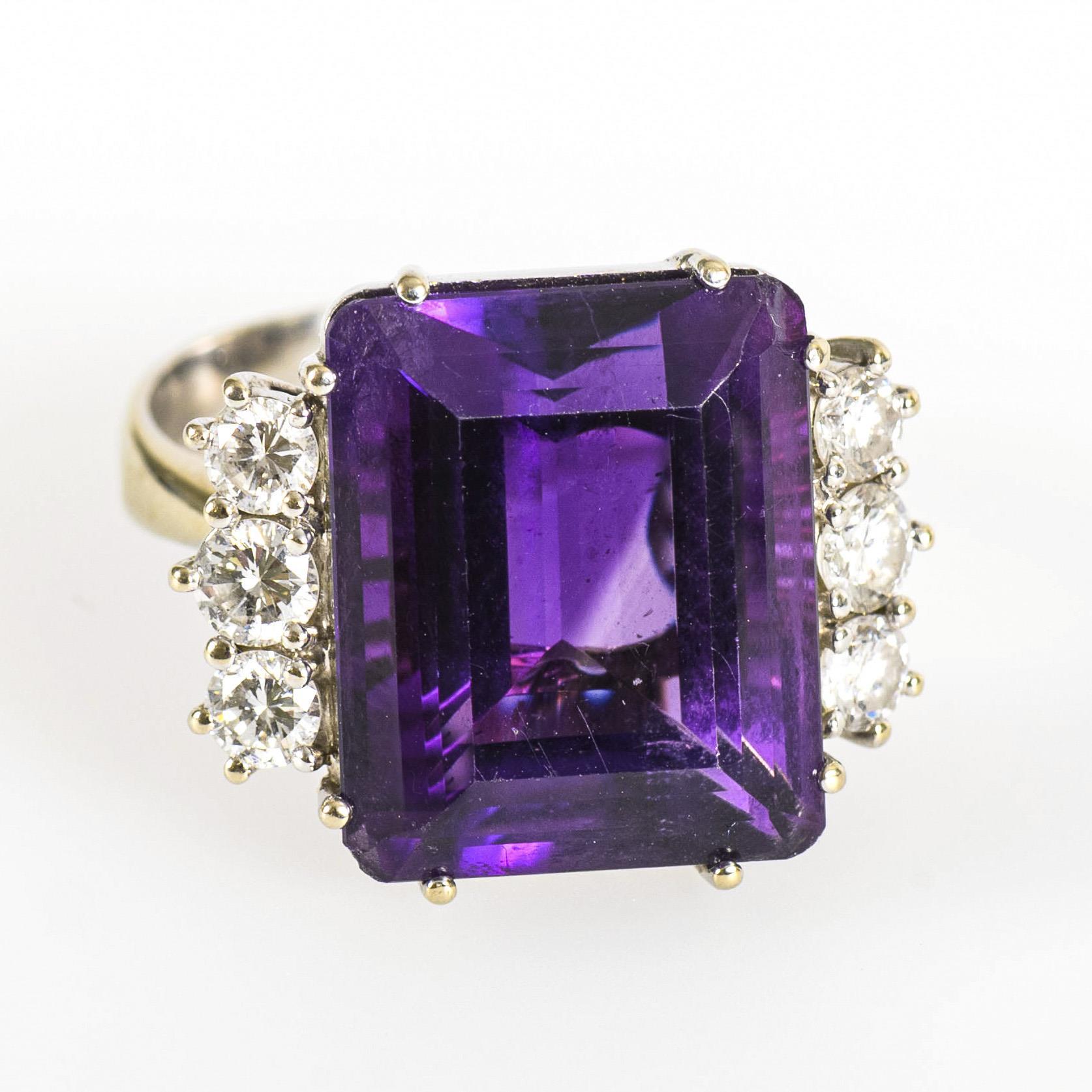 Weißgold 750 geprüft. Amethyst ca. 14,60 ct. Brillanten zusammen ca. 0,60 ct/G-H/vs-si. Ringgröße 59. 10,4 g.