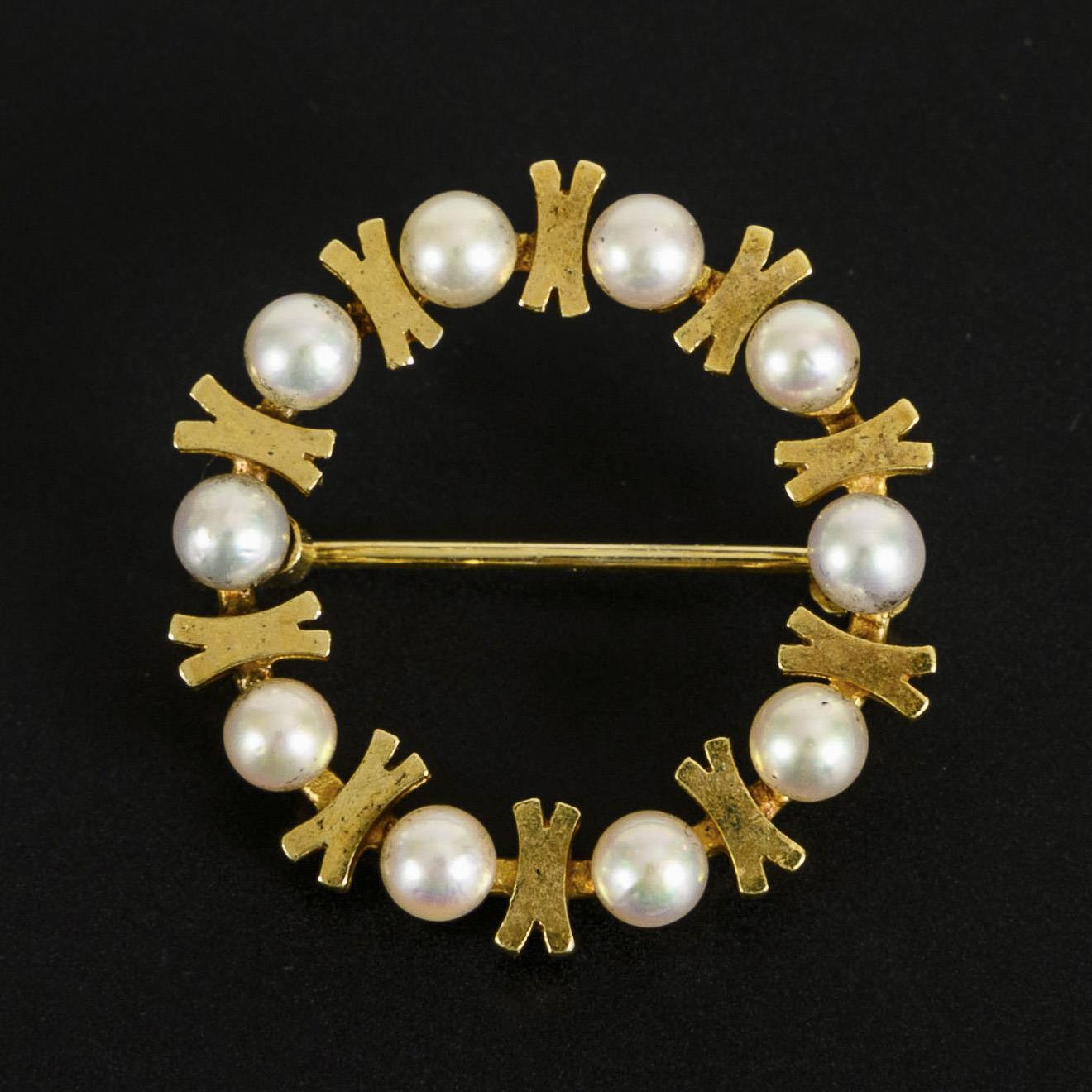 Kleine, runde Brosche, abwechselnd mit x-förmigen Gelbgoldelementen und Perlen verziert, die Nadel mit Kugelhaken.