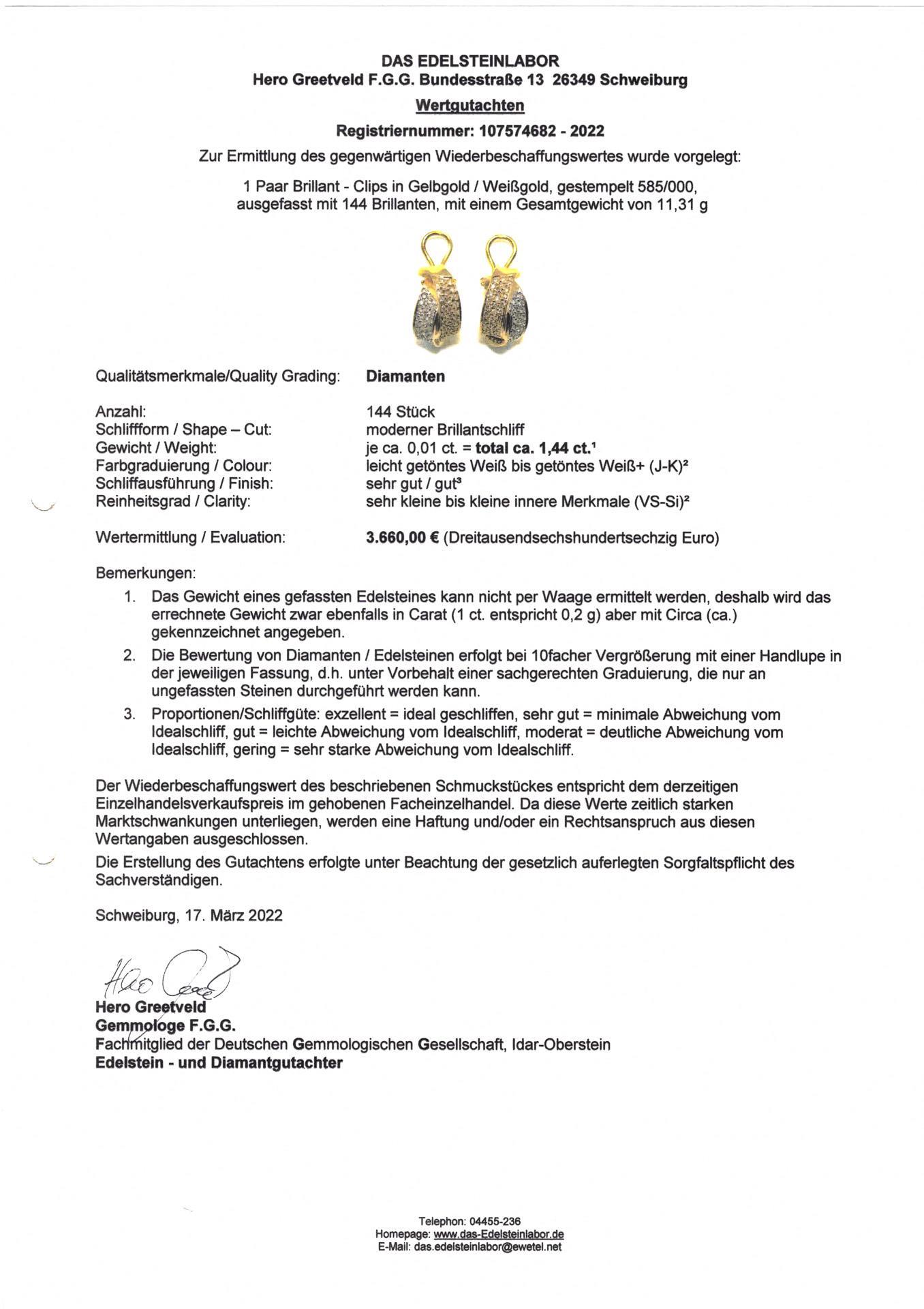 Ohrclips in Weißgold und Gelbgold mit pavégefasstem Brillantbesatz. Passend zu Anhänger an Kette Kat-Nr. 157.