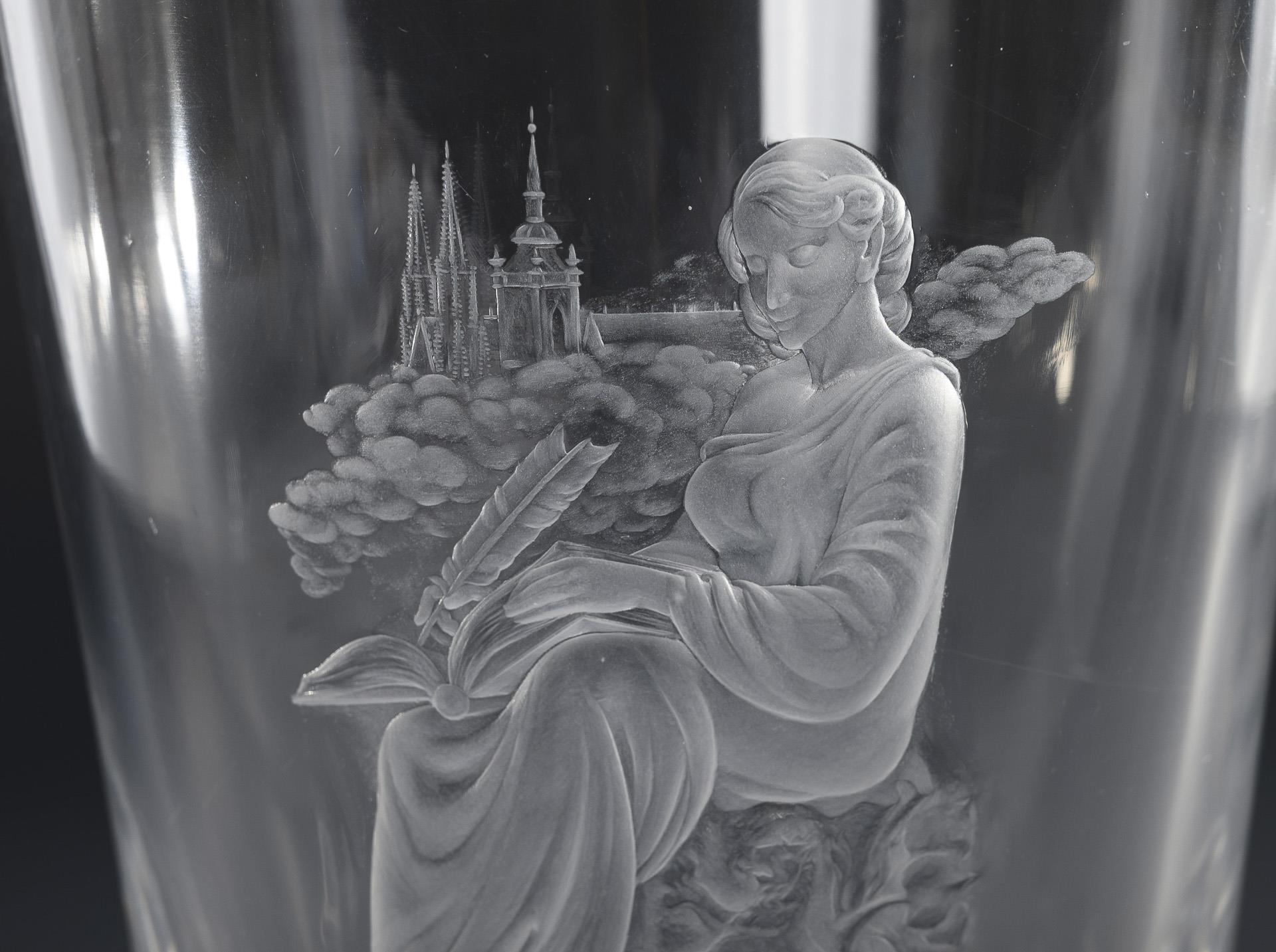 Glockenvase mit facettiertem Stand; ausgekugelter Abriss. Schauseitig die gravierte Darstellung des in den Wolken sitzenden, schreibenden Evangelisten Markus mit Löwe. Kleiner Chip am Stand und einer Facettenkante.