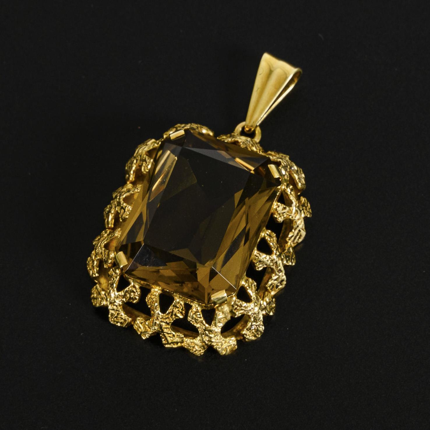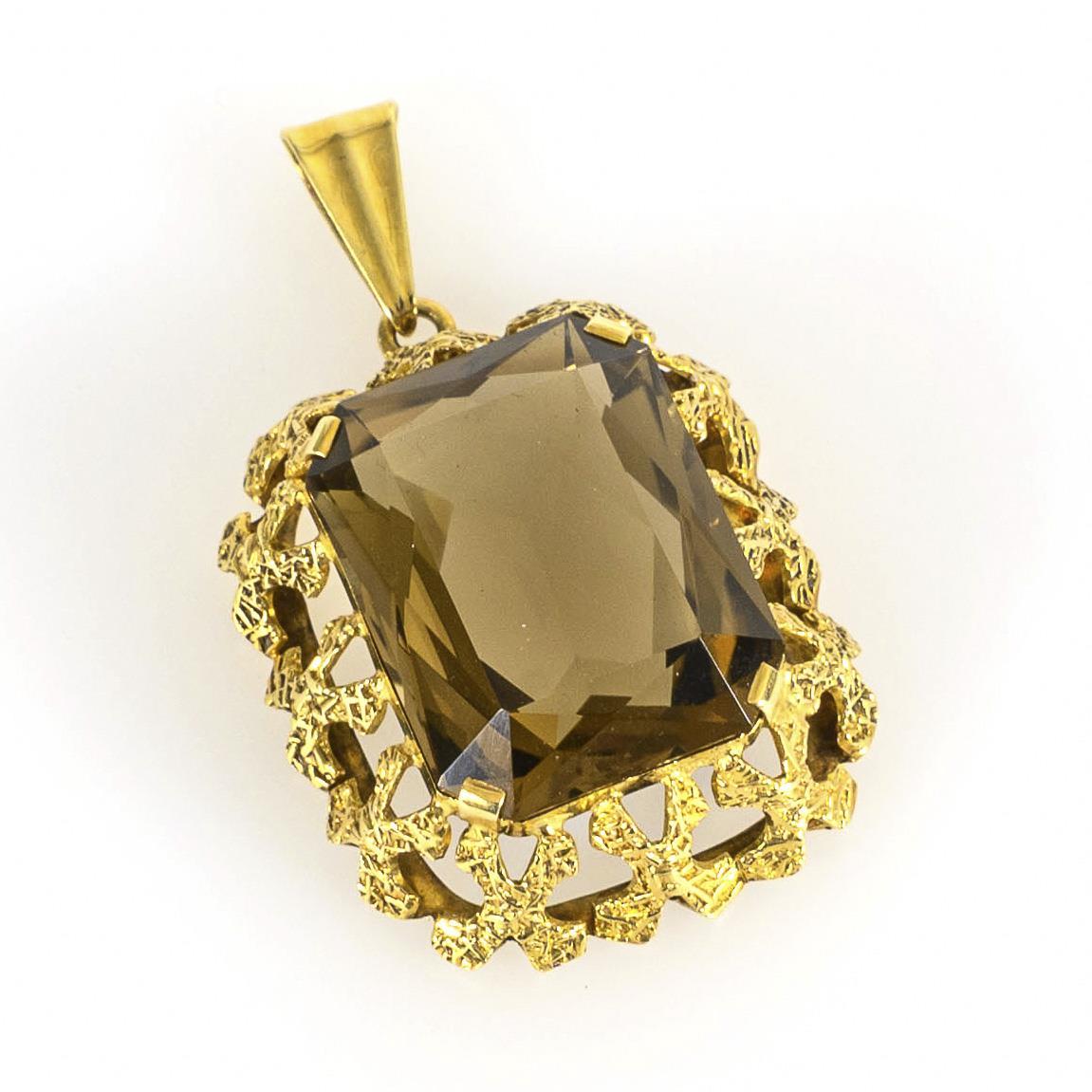 Erhabener Anhänger mit Rauchtopas in durchbrochen gearbeiteter Fassung.