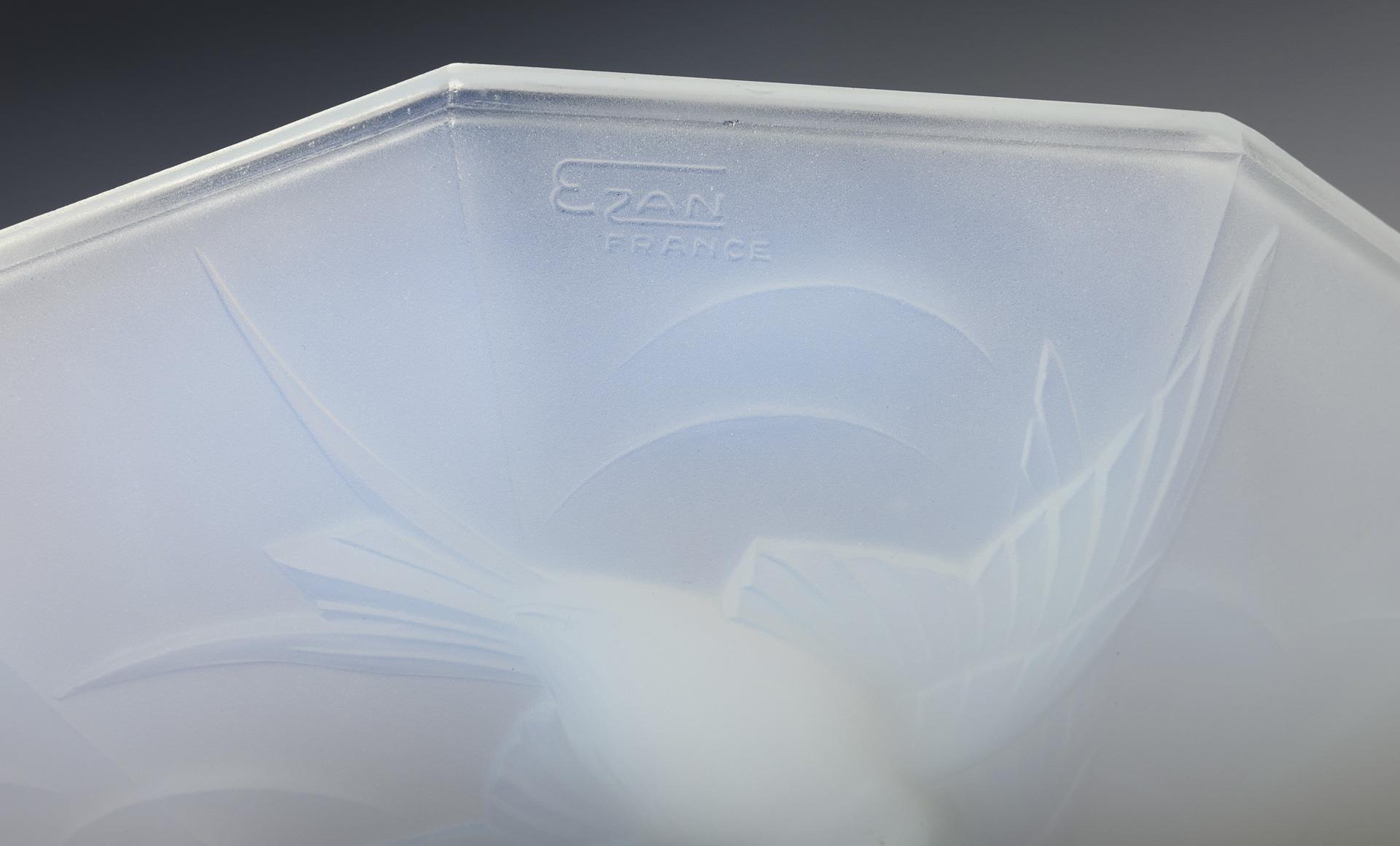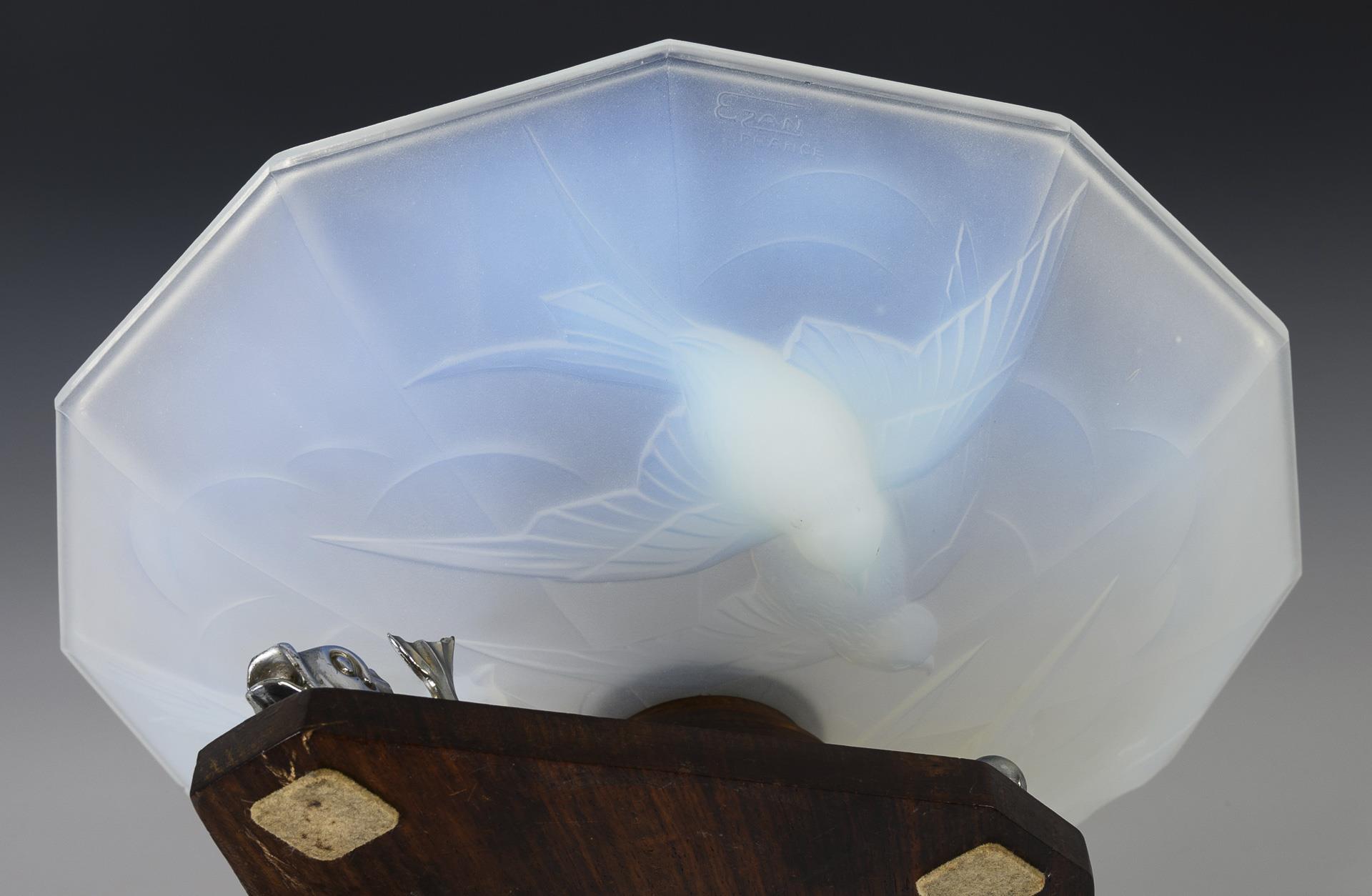 Polygonale Schale aus formgepresstem Opalglas mit Schwalbenrelief, auf einem konischen, getreppten Fuß aus Holz und Metall, Fußplatte aus Holz mit zwei Metallkugeln und zwei plastischen Delfinen.