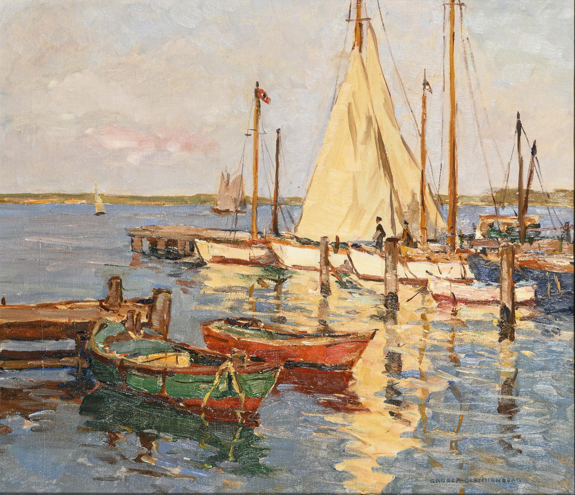 Mehrere Boote an den Stegen im Sonnenschein unter leicht bedecktem Himmel.