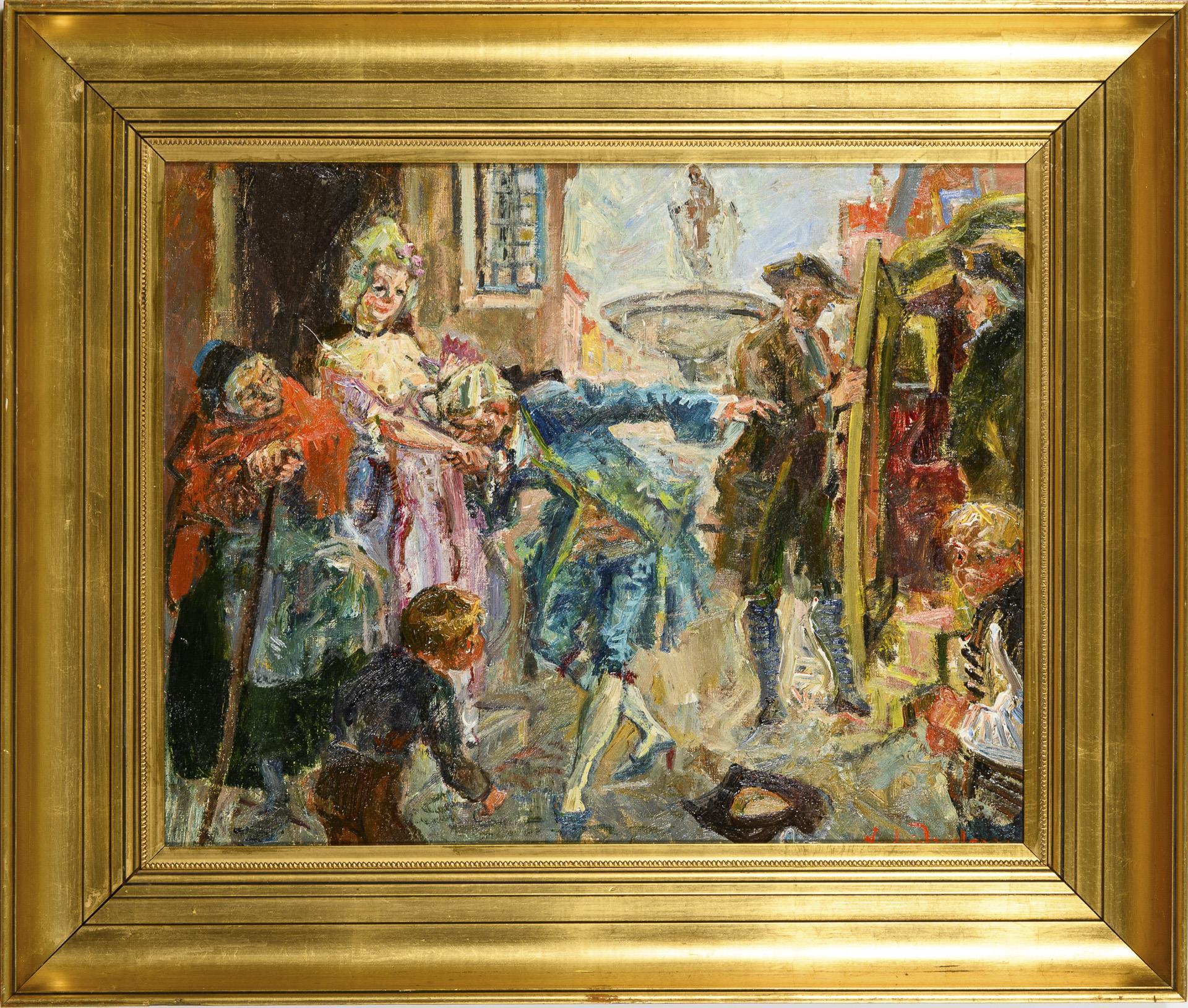 Mehrere Personen in der Kleidung des Rokoko auf der Straße bei einer Kutsche.