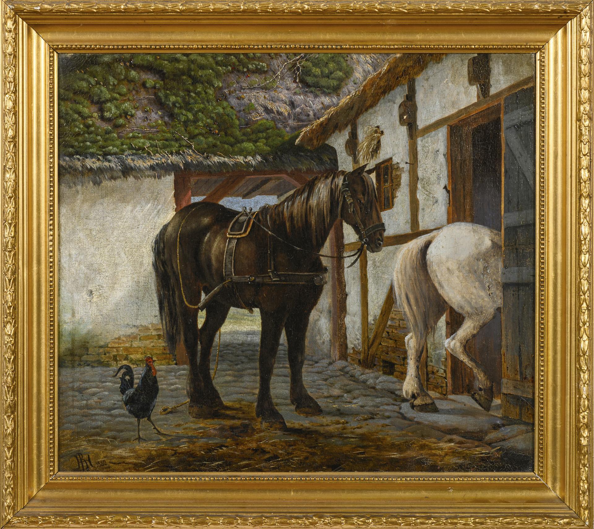 Zwei Pferde und ein Hahn am Eingang des Stalls im Hof. Leichte Altersspuren.