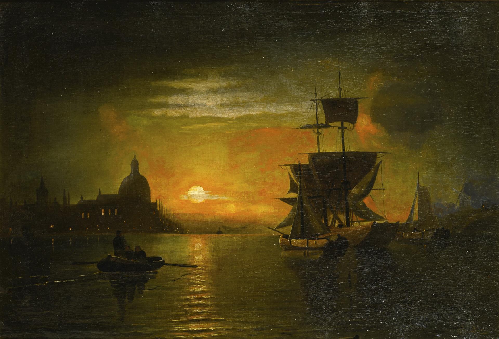 Schiffe bei Vollmond vor der Silhouette der Stadt mit erleuchteten Häusern. Zwei kleine restaurierte Stellen mit Hinterklebungen.