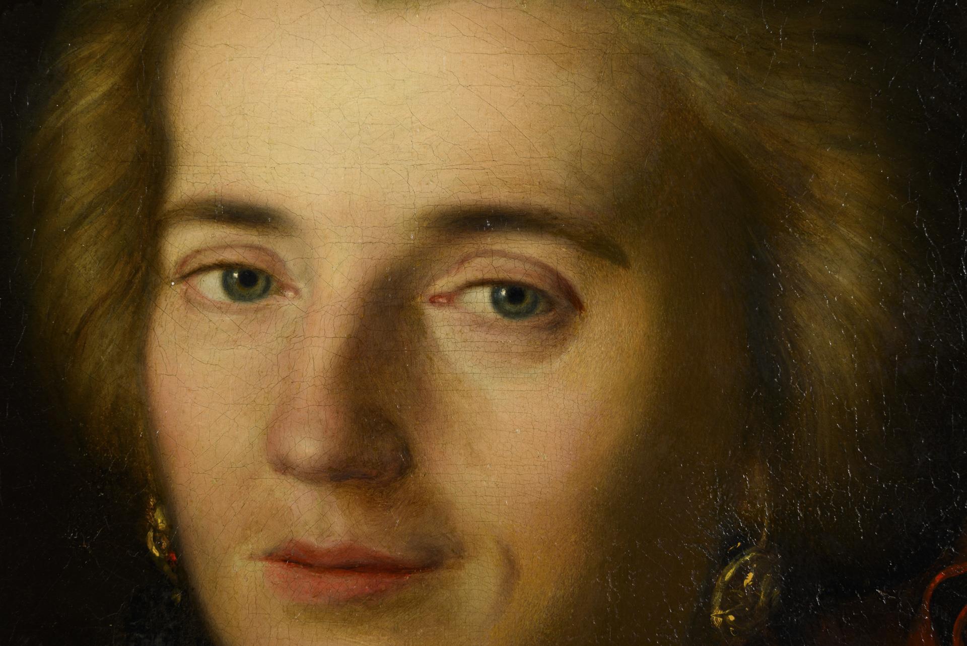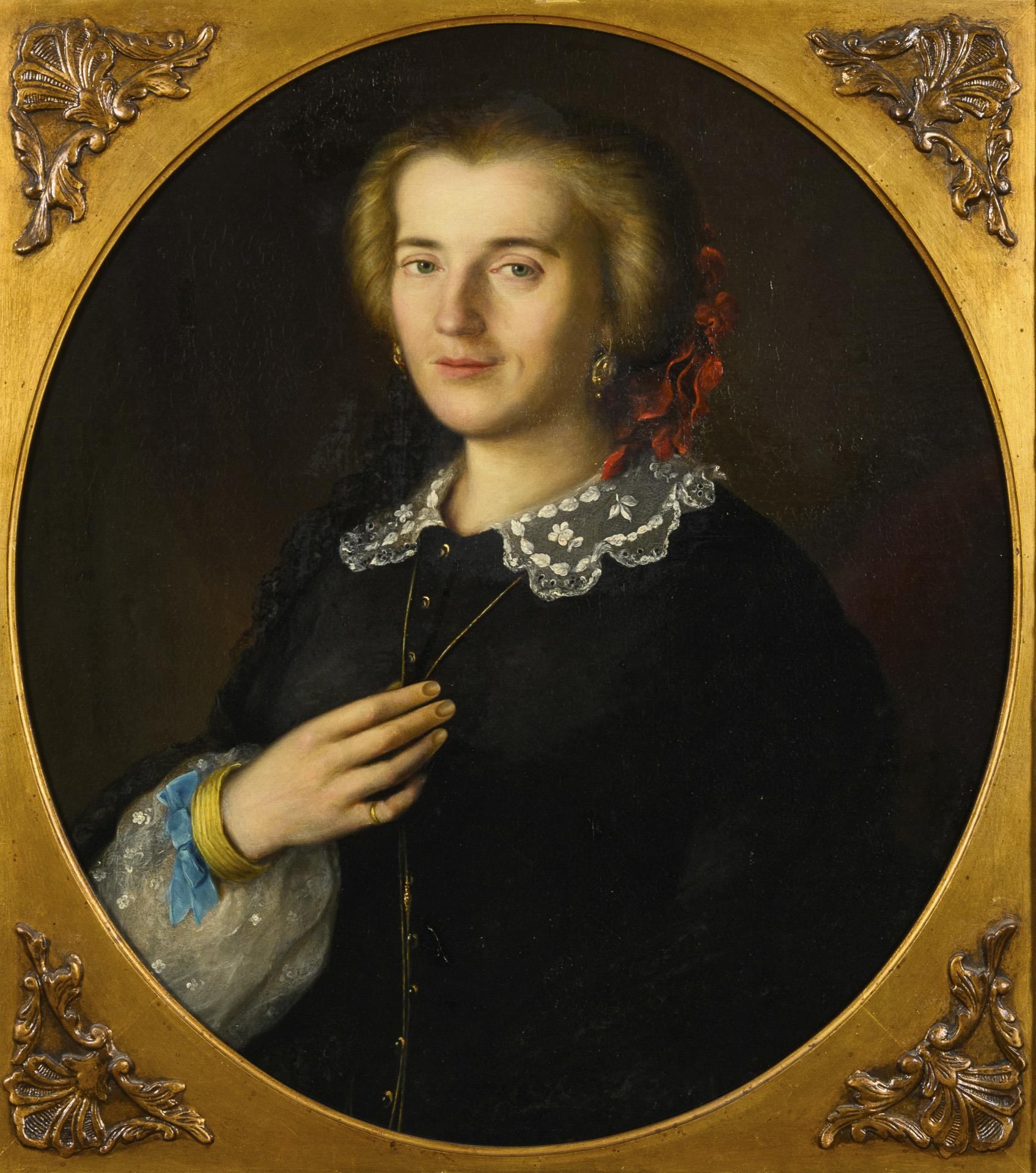 Porträt einer jungen Frau im schwarzen Kleid mit Goldschmuck. Leinwand doubliert.