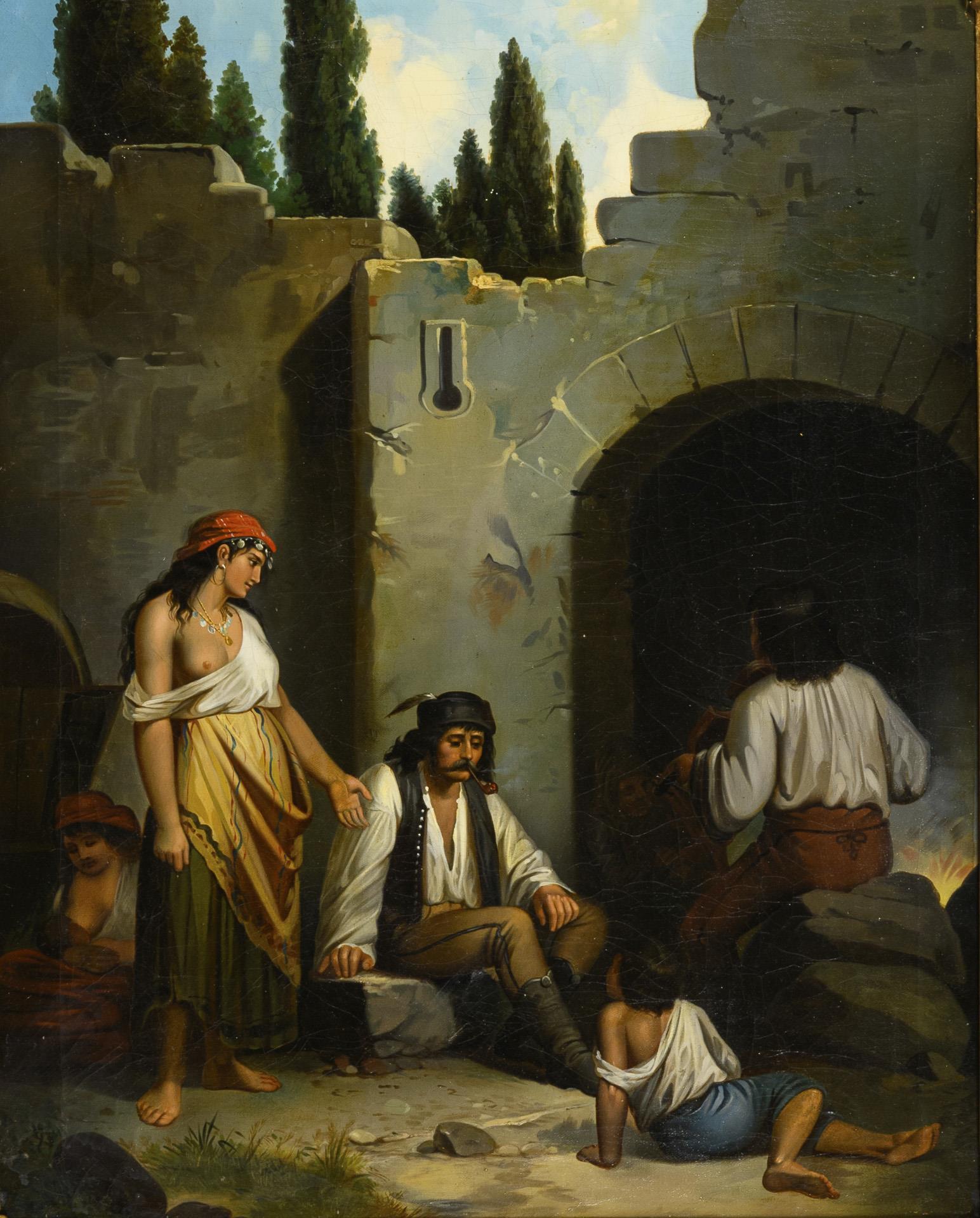 Genreszene mit mehreren Personen am Eingang einer Ruine, im Sonnenschein. Leichte Altersspuren.