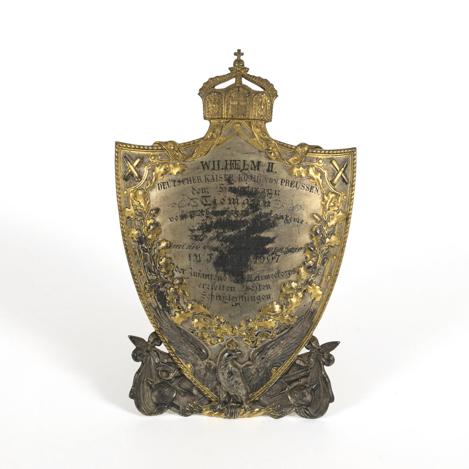Aufsteller in Wappenform mit gekröntem Adler und militärischen Trophäen als Fuß, geprägtem Eichenkranz als Rahmung sowie deutsche Reichskrone als oberer Abschluss. Auf dem Schild Gravur: "Wilhelm II. Deutscher Kaiser, König von Preussen dem Hauptmann Tiemann vom 7. Rheinischem Infanterie=Regiment Nr. 69 zur Erinnerung an die von seiner Kompanie im Jahre 1907 innerhalb der Infanterie des VIII. Armeekorps erzielten besten Schießleistungen". Vergoldung teils berieben, Zaponierung berieben/zerkratzt.