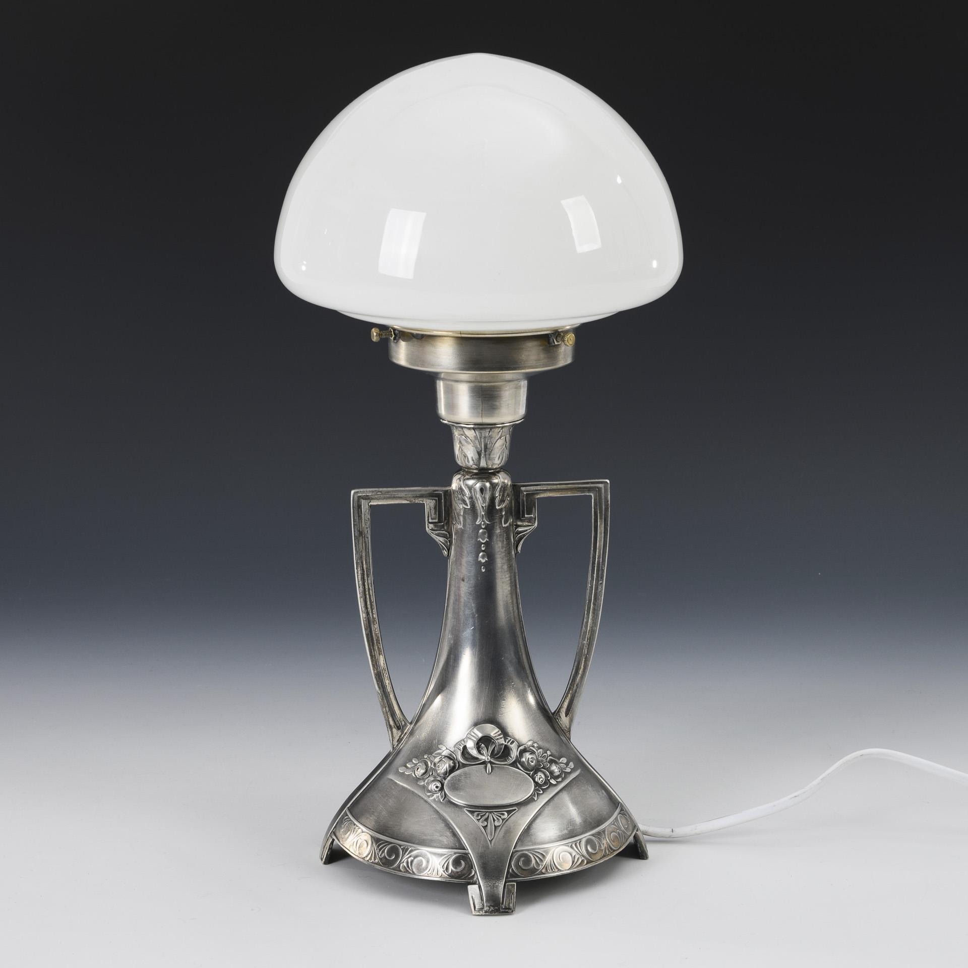 Konischer Rundfuß, der in den Schaft übergeht und von 2 Winkelhandhaben flankiert wird. Beidseitig vegetabiles Jugendstil-Ornament mit leeren Kartuschen. Auf der Tülle montierte Halterung für den pilzförmigen Glasschirm. Versilberung berieben. Wohl jünger elektrifiziert, funktioniert.