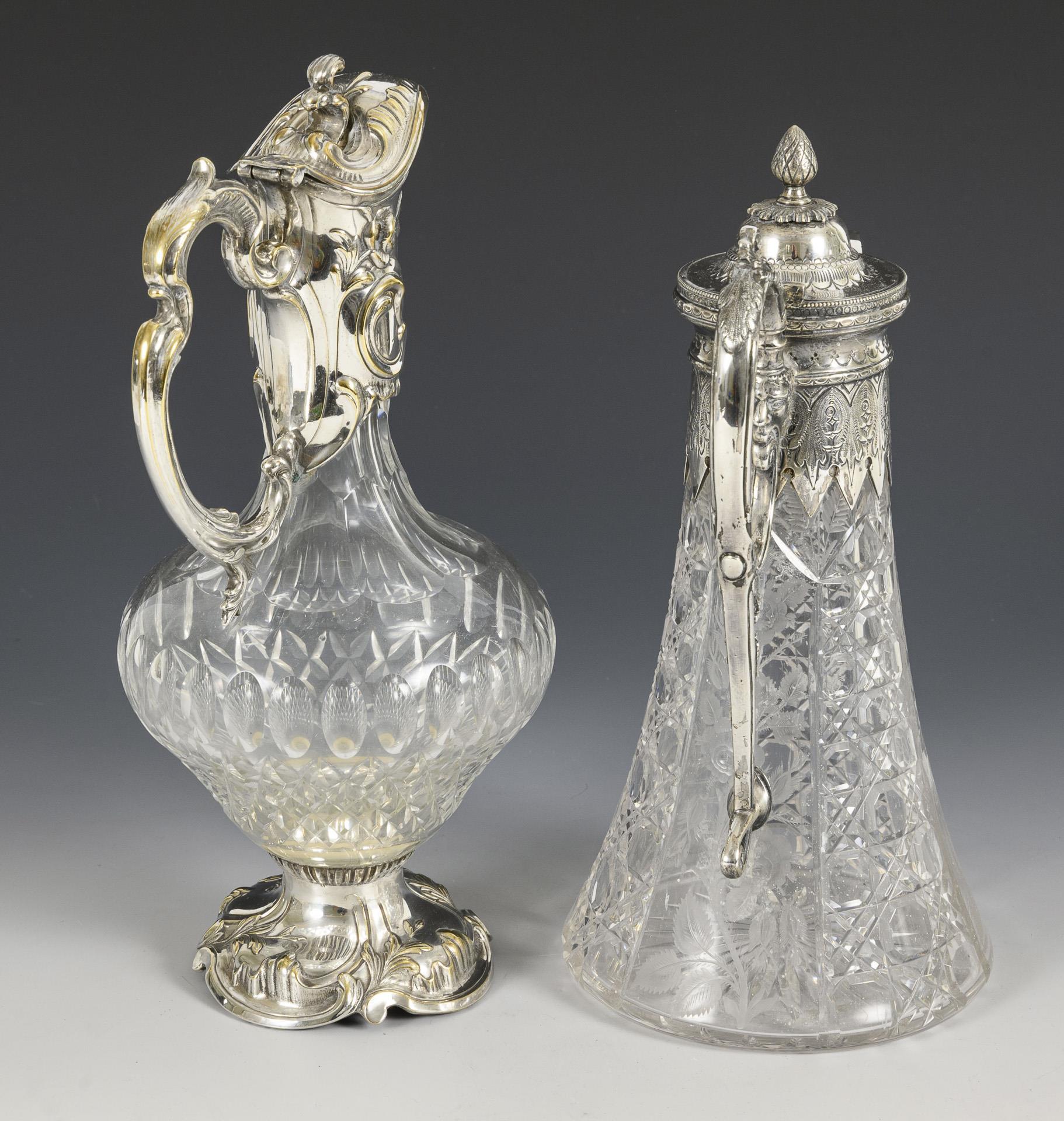Konische Karaffe mit Steinelschliff und Rosengravur, reich verzierte Metallmontierung mit Maskaron-Schneppe und geschweiftem Henkel. (H 28 cm). / Bauchige Karaffe mit Steinel-, Oliven- und Facettenschliff, reliefierte Metallmontierung mit Rosen und Rocaillen (H 30 cm). 1x Versilberung berieben.