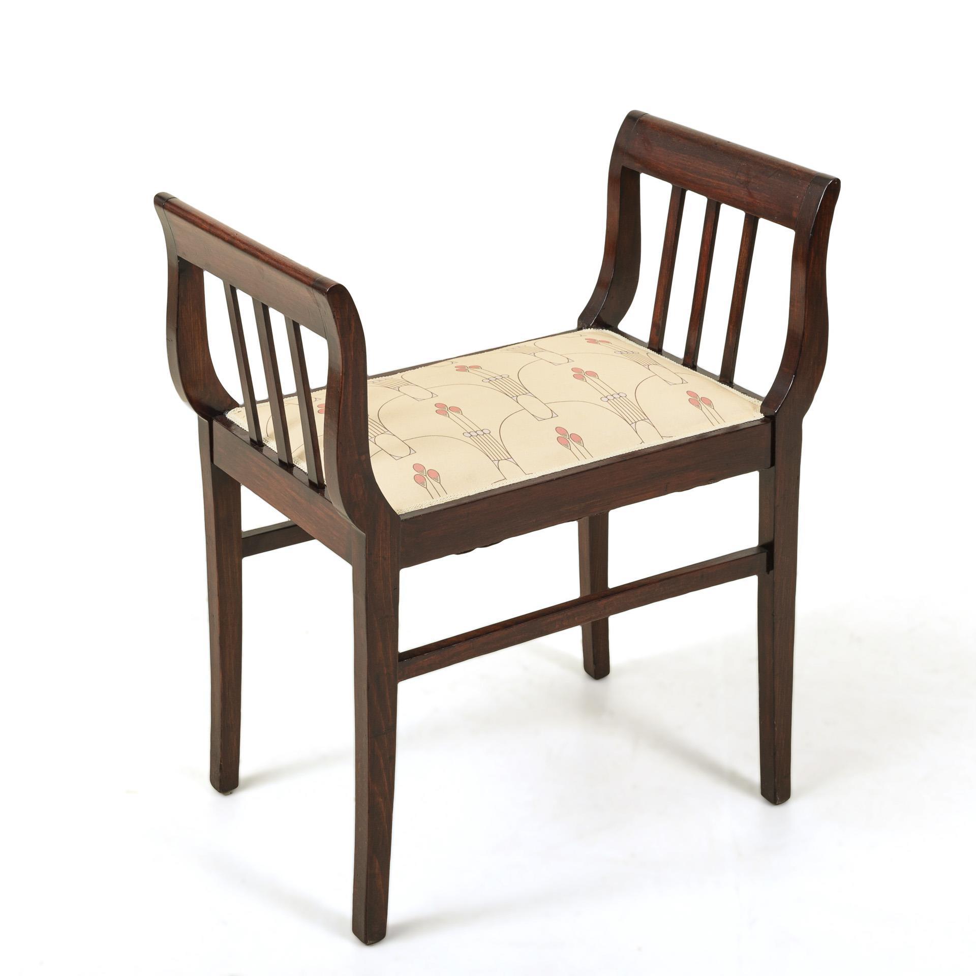 Kleine Sitzbank mit s-förmig geschwungenen Seitenstützen, jünger ergänzte Polstersitzfläche mit stiltypisch ergänztem Stoffbezug nach einem Entwurf der Wiener Werkstätten, auf 4 querverstrebten Vierkantbeinen.