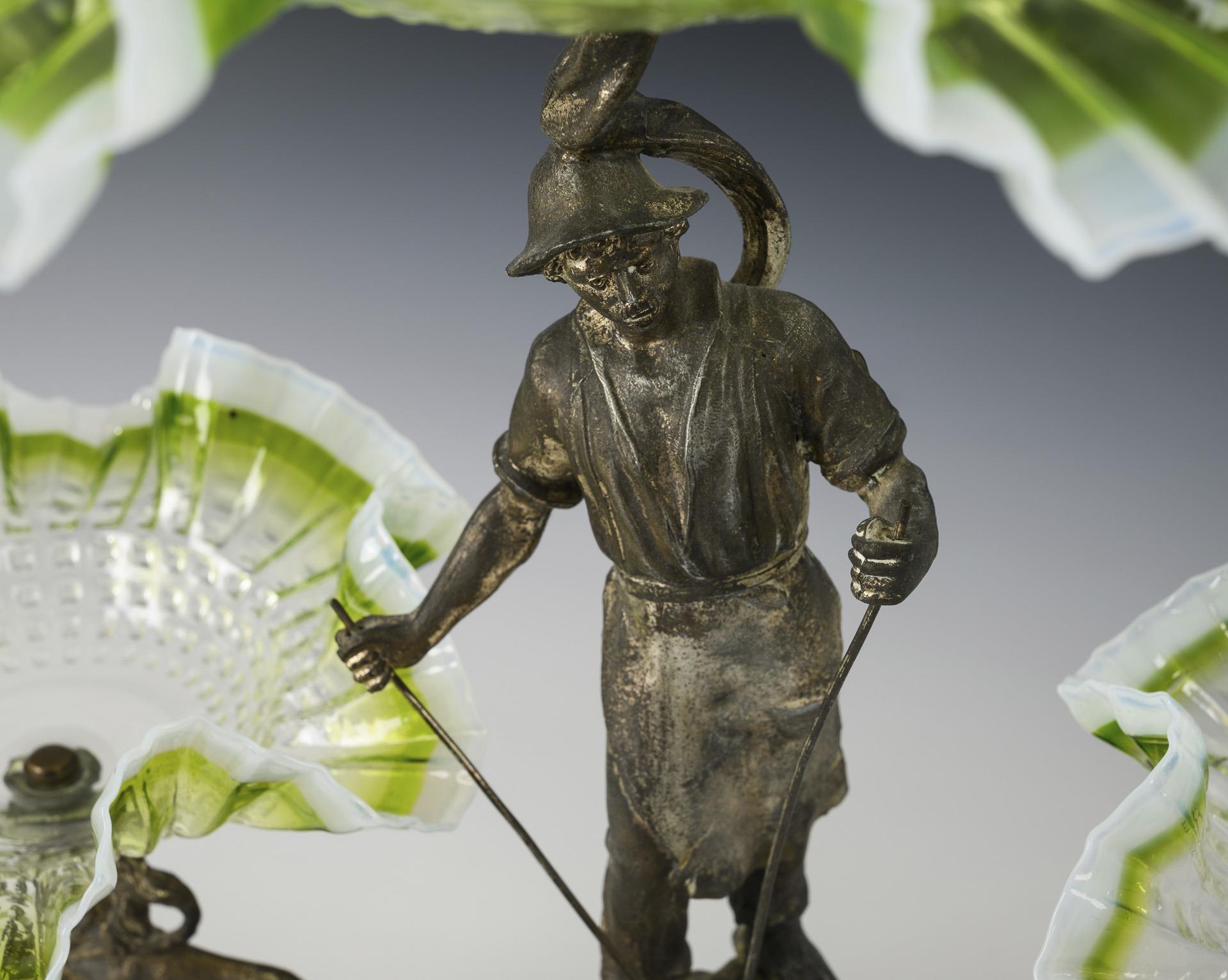 Ovaler Fuß mit Reliefornament, vollplastischer Gießereiarbeiter als Mittelschaft, flankiert von Löwen; je als Halter für die gestuften Glasschalen mit Waffeldekor und gekniffenem Rand. Metall angelaufen.
