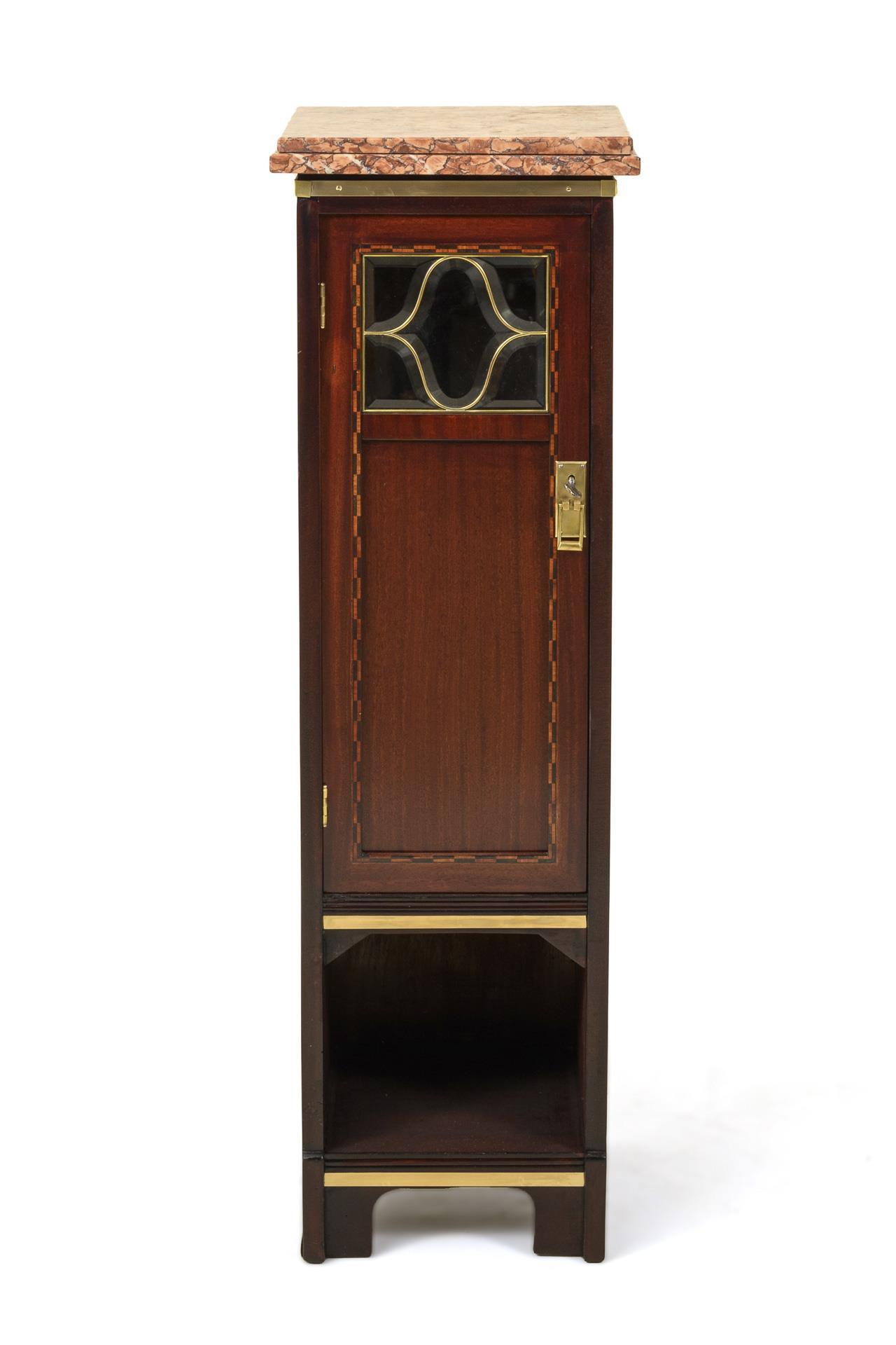 Schlanker 1-türiger Korpus mit doppelter Marmordeckplatte und offenem Sockelfach. Facettiertes Türglas mit stilisiertem Blütensegment, Messingzierbänder, Messingschlüssellochbeschlag mit Bügelgriff. Innen 1 Einlegeboden.