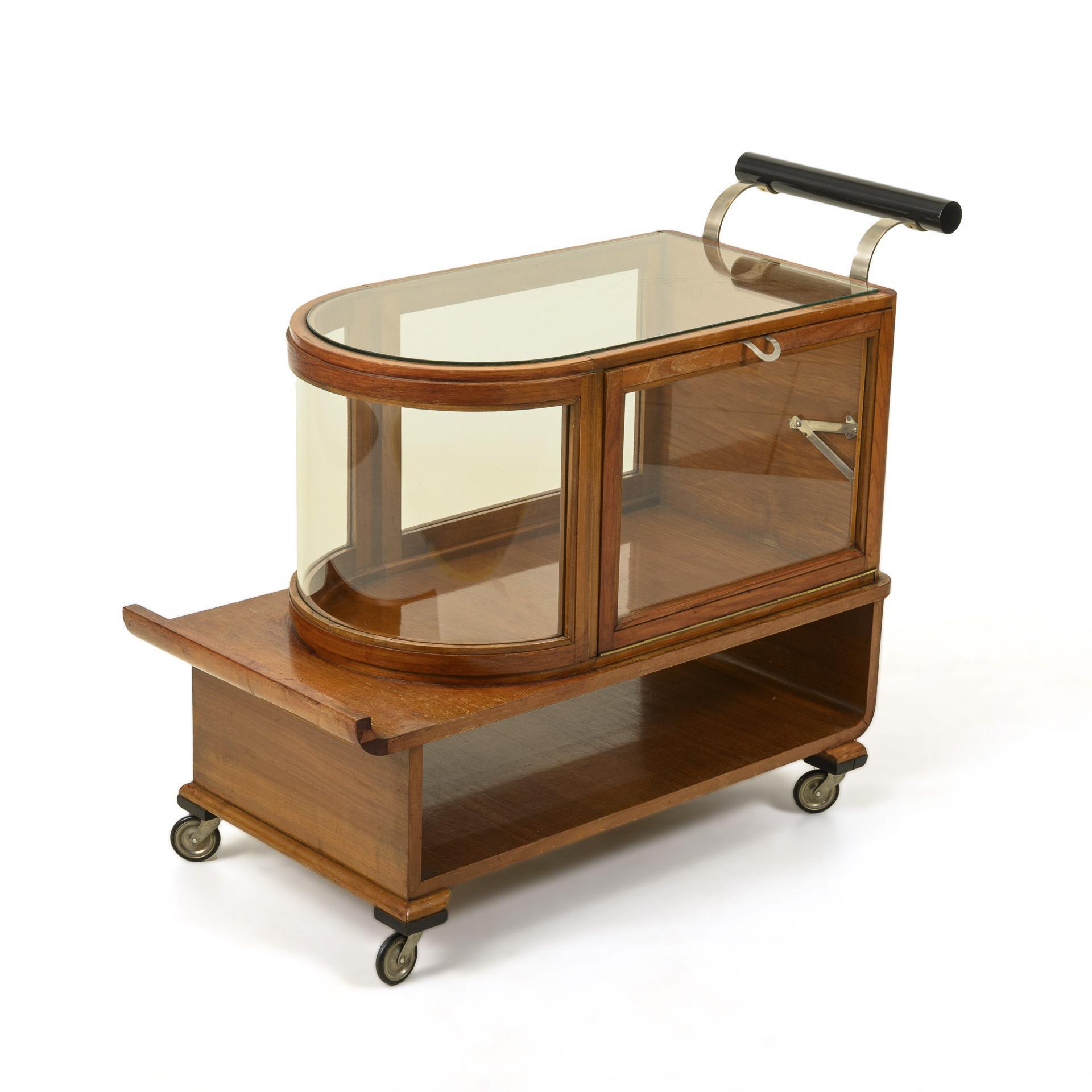 Vitrinenwagen mit einem 4-seitig verglasten, teilgerundeten Barfach und seitlicher Klappwand, auf vorkragender Sockelplatte mit nach oben gerolltem vorderen Kantenabschluss, offenes Sockelfach, auf 4 Rollen. Metallgriffe, teils mit ebonisiertem Rundholz. Obere Glasplatte abnehmbar. Alters- und Gebrauchsspuren, partiell Furnierfehlstellen und Defekte.